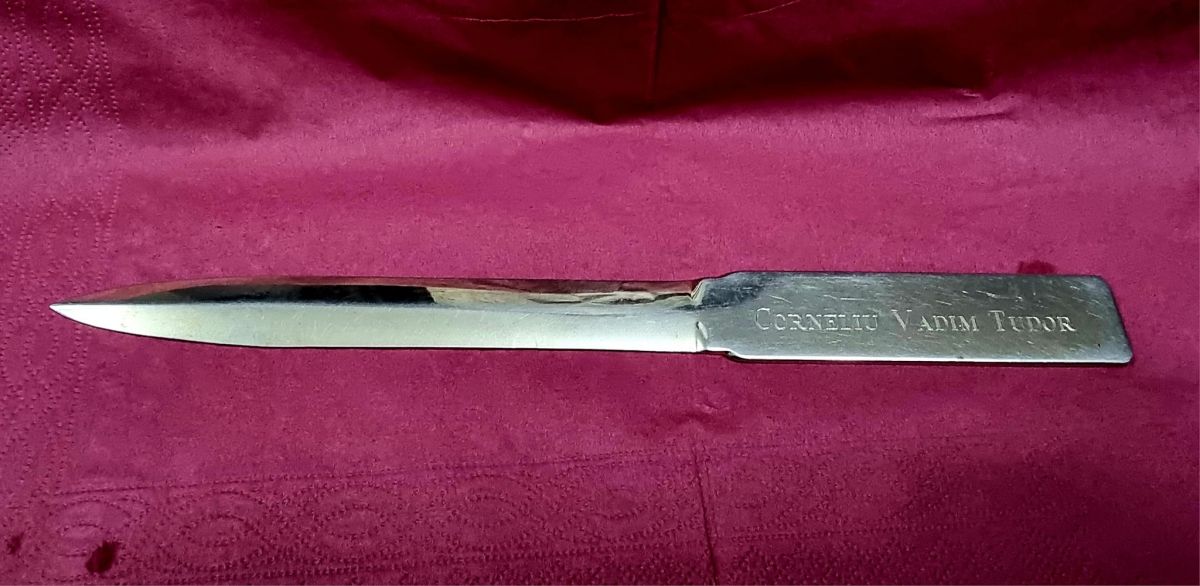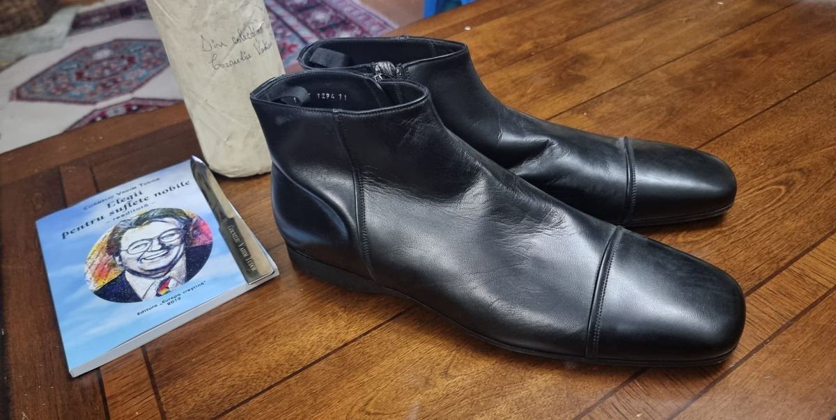 Printre altele, i-a înmânat omului de afaceri botoșănean o sticlă de vin cu tricolor din colecția poetului, o carte reeditată, o pereche de ghete și un cuțit pentru deschis scrisorile.