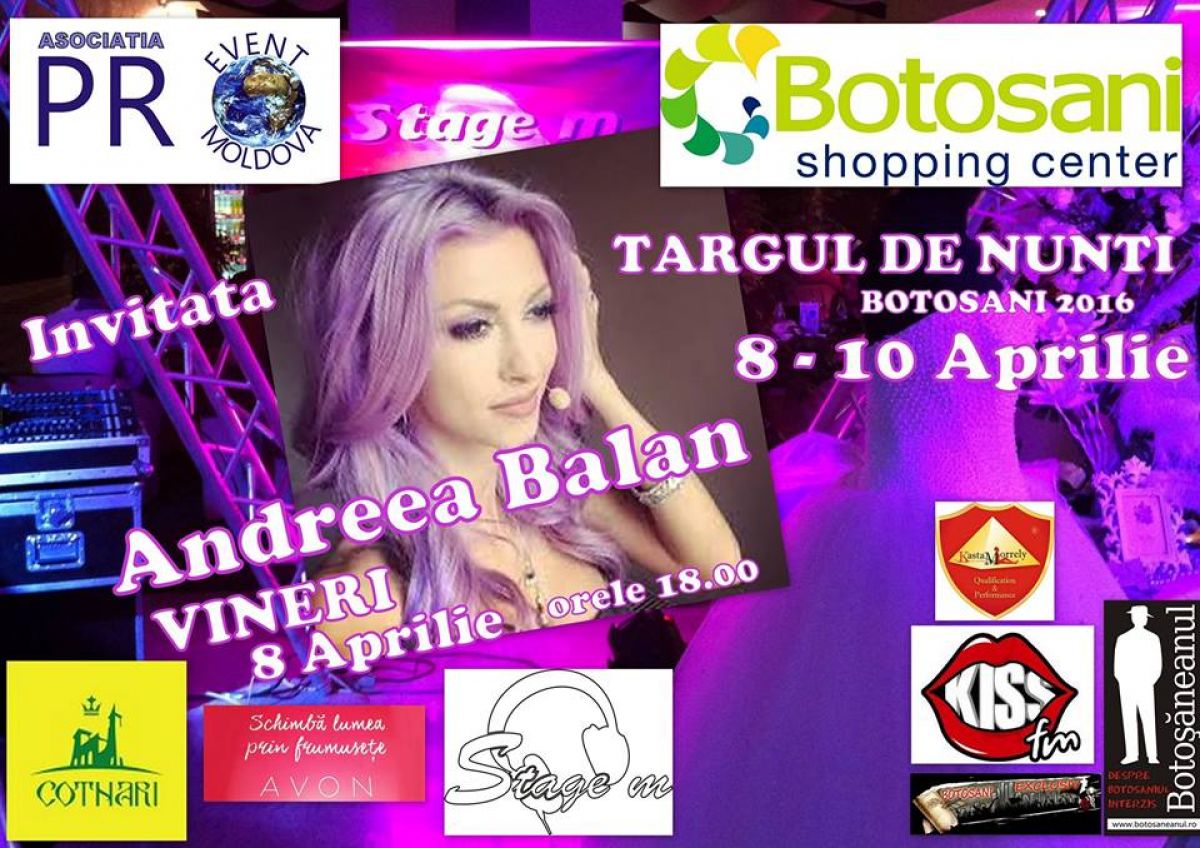 Cu această ocazie, una dintre cele mai frumoase cântărețe din showbiz-ul românesc va veni din nou în oraș pentru a face un super show alături de dansatoarele sale. Este vorba despre Andreea Bălan, fata cu părul albastru care face senzație atunci când urcă pe scenă. Ea a fost invitată pe data de 8 aprilie 2016, la ora 18.00, în Shopping Center, acolo unde Asociația PR Event Moldova va organiza un târg de nunți. Cele interesate de achiziționarea unei superbe rochii de mirese, invitații de nuntă sau aranjamente florale pot vizita târgul până duminică, 10 aprilie.