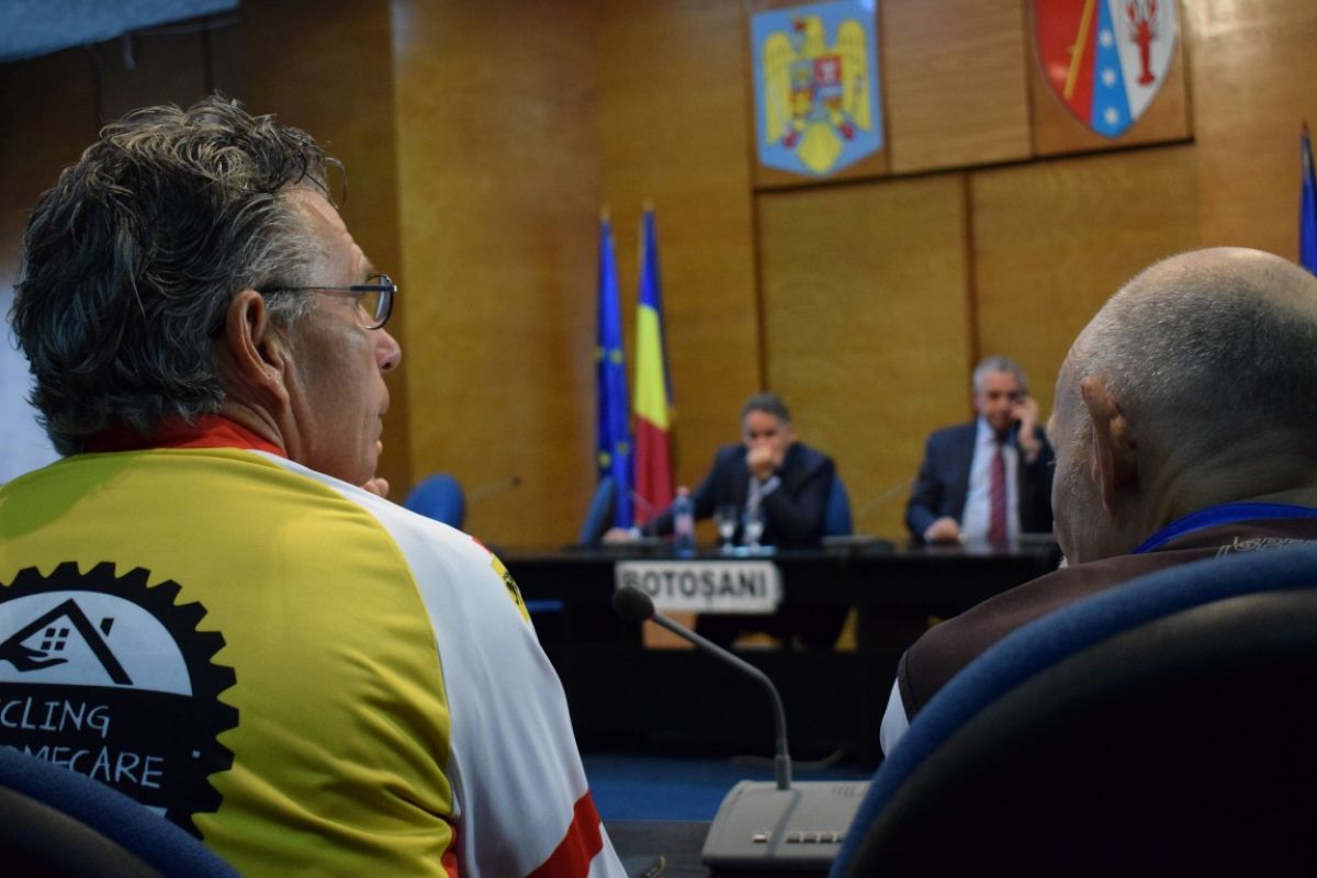 Președintele Consiliului Județean, Costică Macaleți a avut o intervenție de aproximativ cinci minute la întâlnirea cu belgienii care pedalează pentru înființarea de servicii medicale de lungă durată la domiciliile mai ales a bătrânilor din mediu rural.