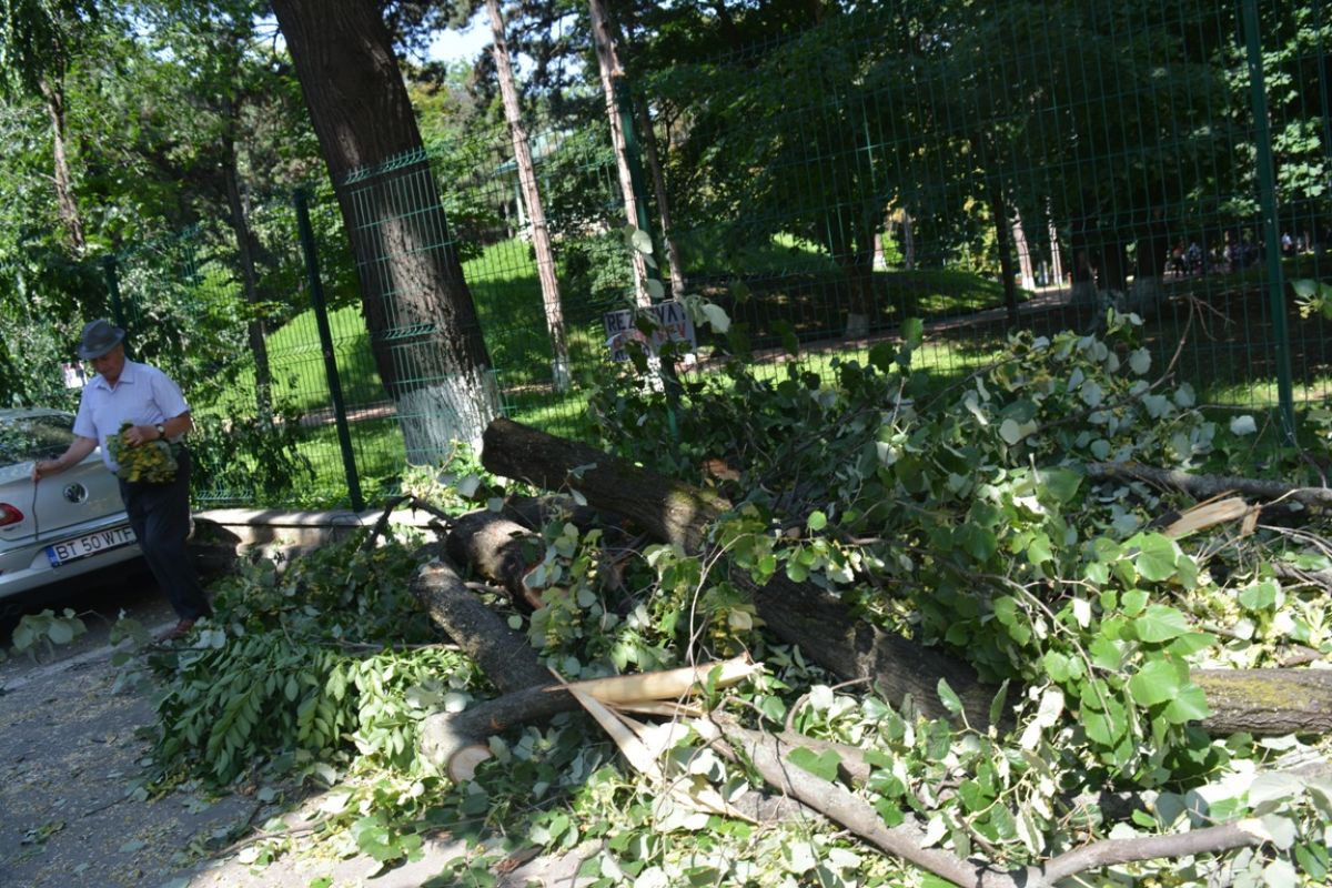 Pierderea lor a fost însă câştigul altora. Iar asta s-a văzut şi sâmbătă la amiază, când un copac de la marginea parcului Mihai Eminescu s-a crăpat, a rupt un gard şi a avariat un Volkswagen Passat parcat pe strada Vârnav din municipiu.