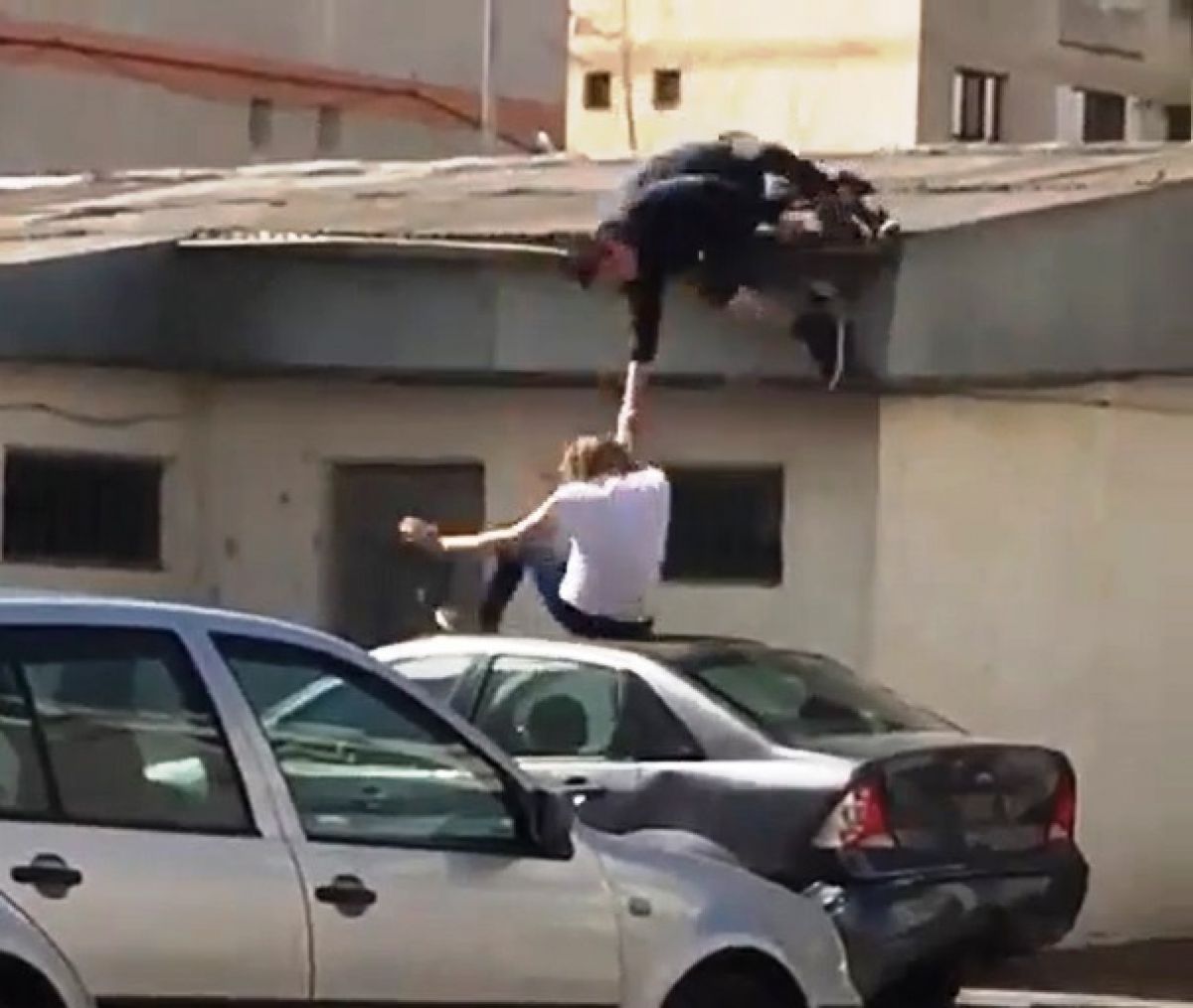 Rezultatul a fost însă exact pe dos față de ceea ce așteptau cei doi: în loc să urce și celălalt tânăr pe garaj, au căzut amândoi. Norocul lor este că au aterizat pe cupola unei mașini parcate în apropiere.