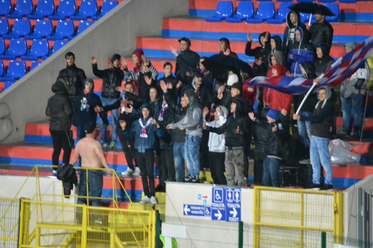 La polul opus se află unul dintre liderii „Ultras BT Nord”, care îşi dirijează galeria dezbrăcat până la brâu.