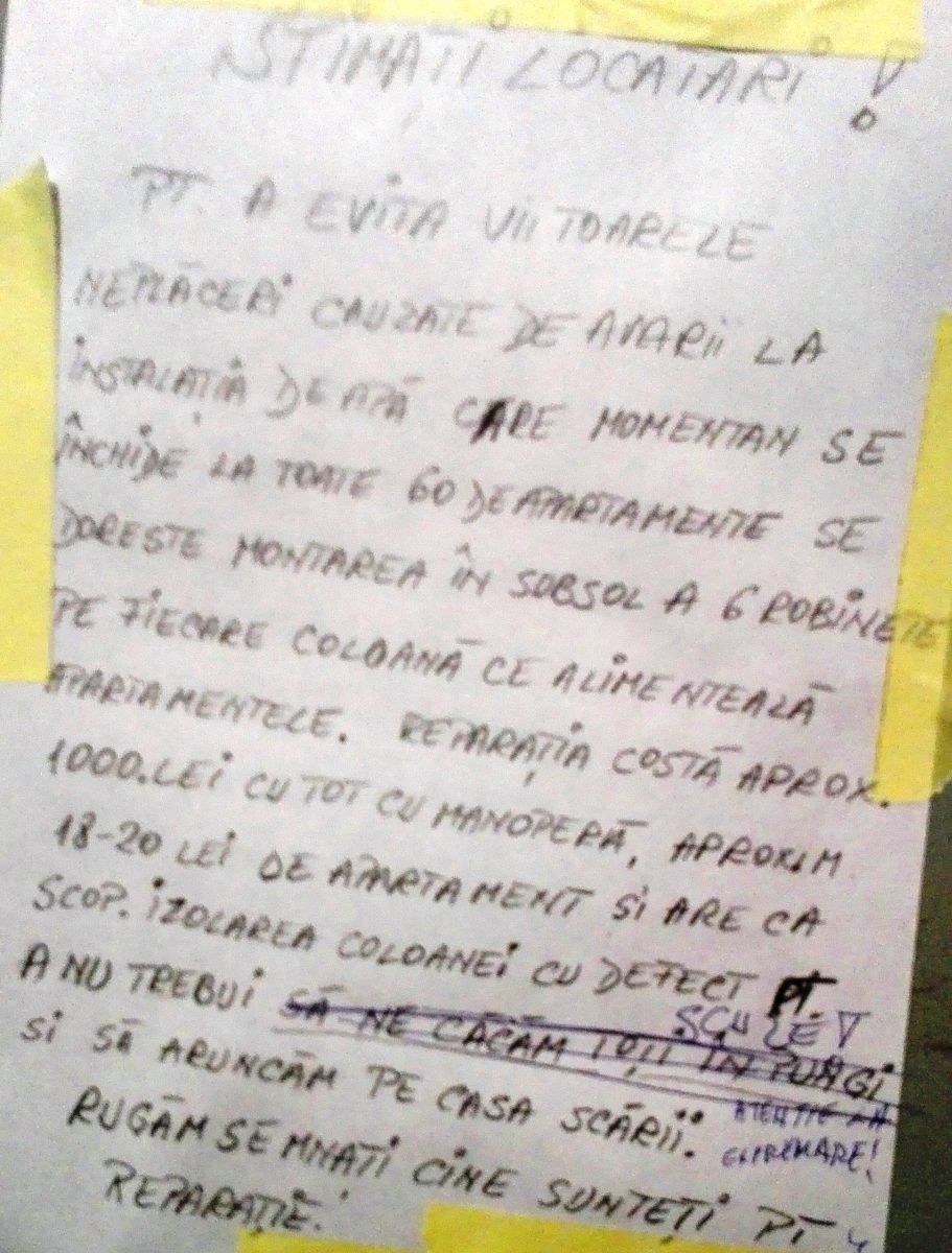 Câteva zile aceştia au rămas fără apă din cauza unei defecţiuni la demisol. Problema a fost rezolvată, însă doar temporar. O soluţie pe termen lung presupune o cheltuială ceva mai însemnată şi de aceea unul dintre proprietari s-a gândit să îşi mobilizeze vecinii. Şi a făcut-o printr-un anunţ fără perdea: