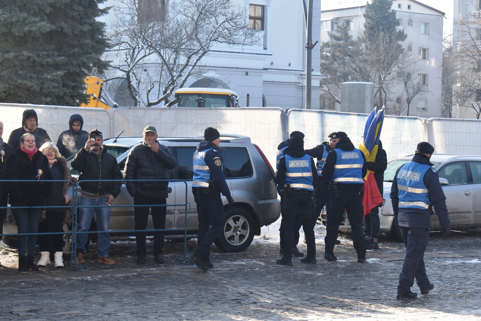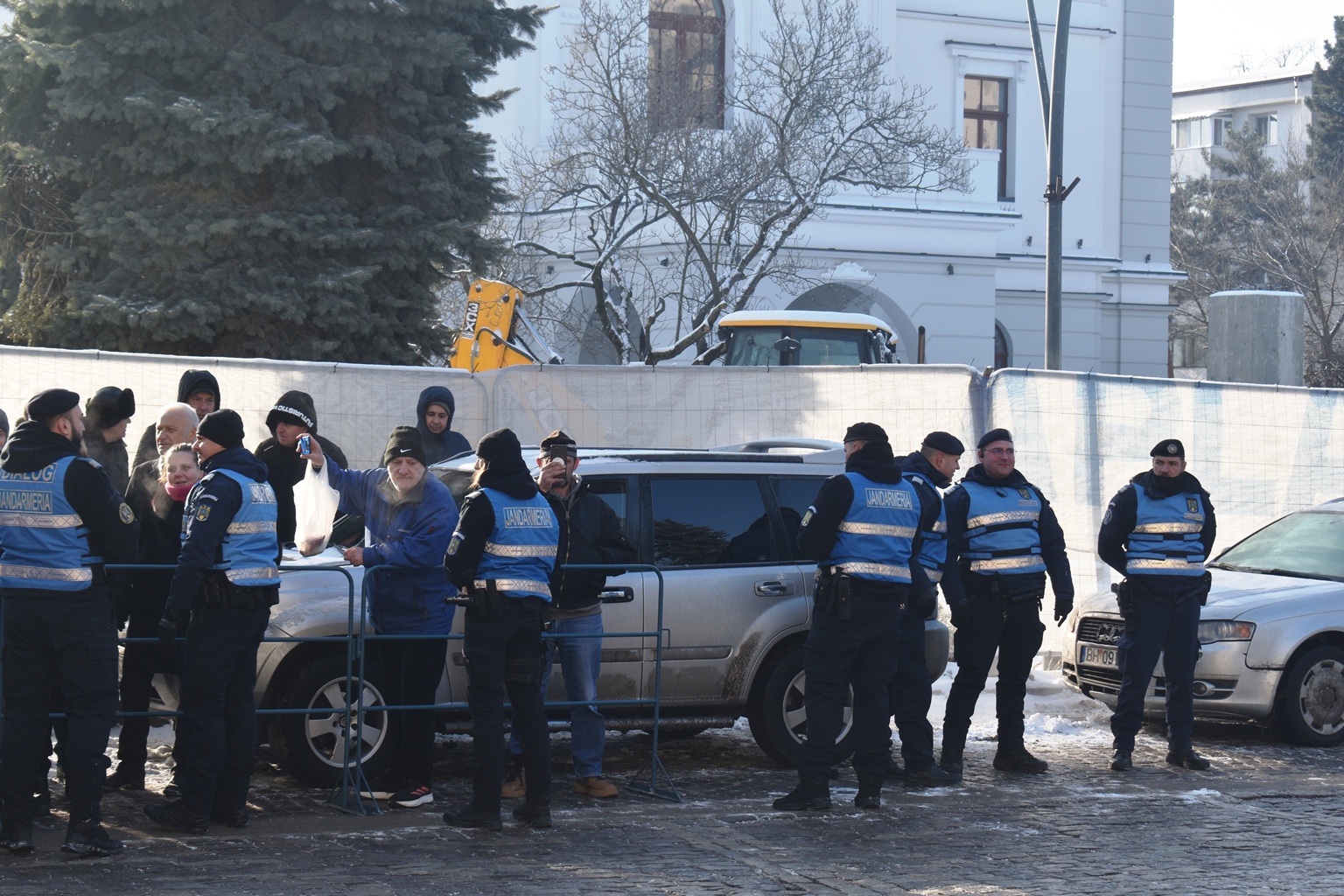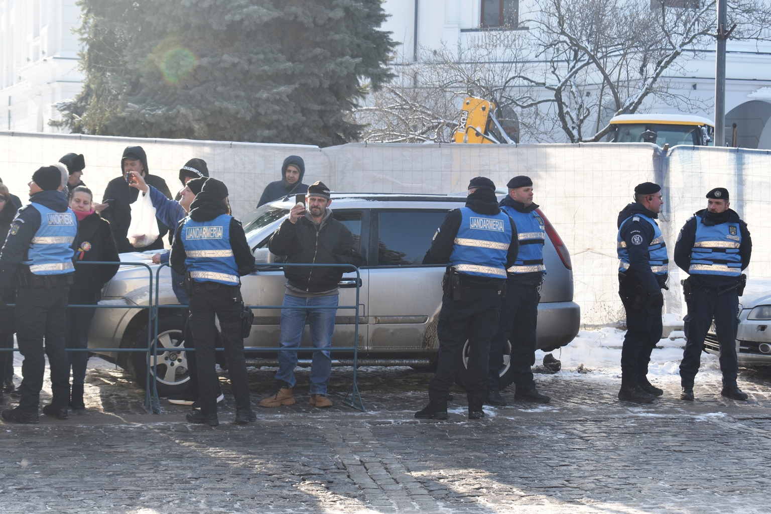 Ca să prevină orice conflict, jandarmii au hotărât să pună garduri, însă cum șoferul încă nu apucase să plece, perimetrul delimitat i-a cuprins și autoturismul.