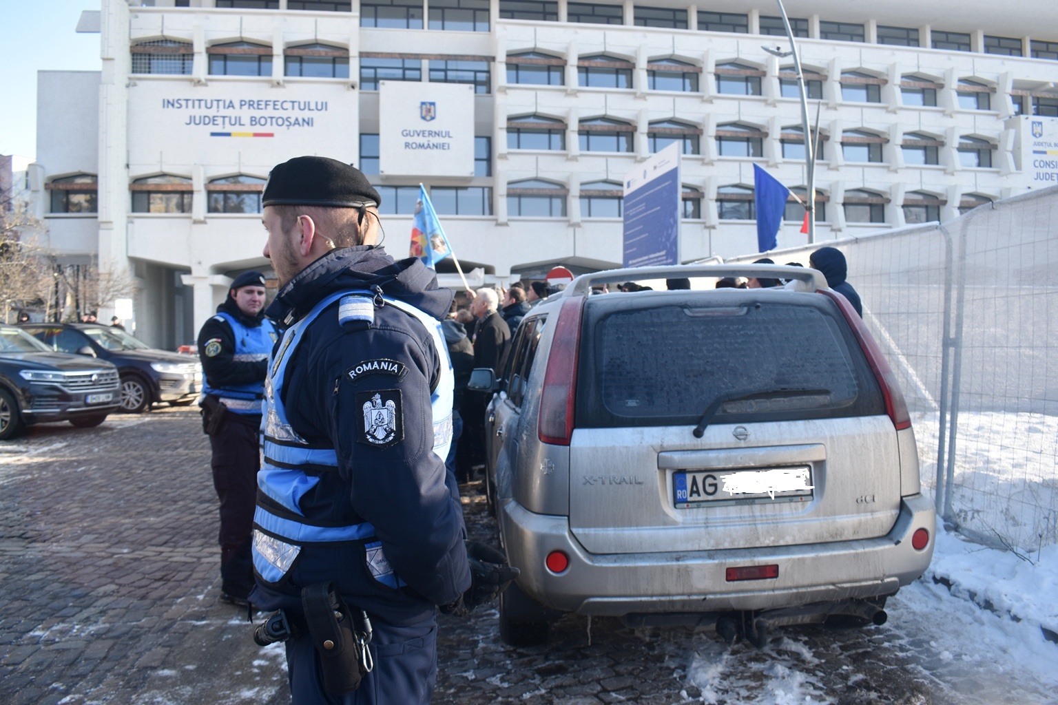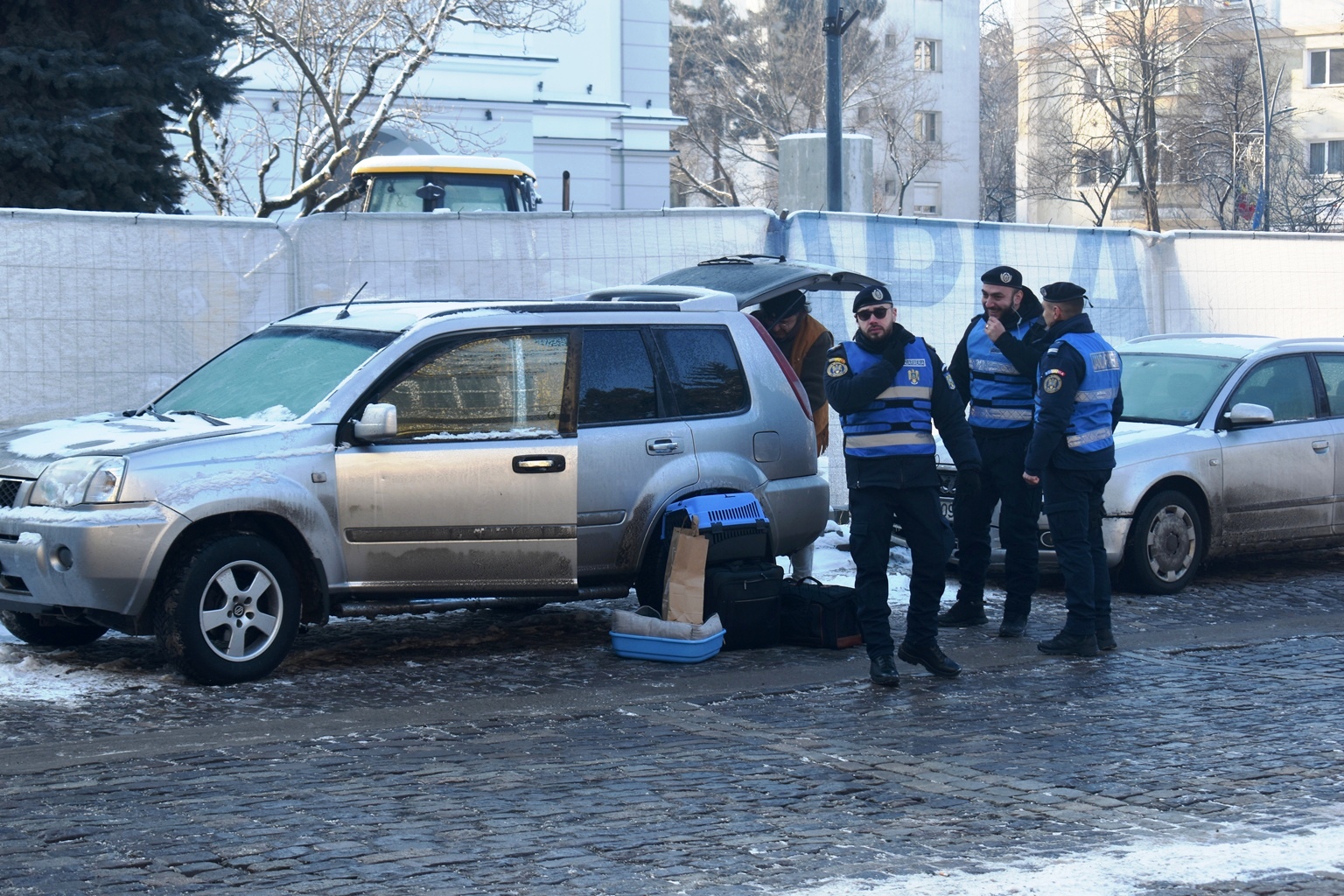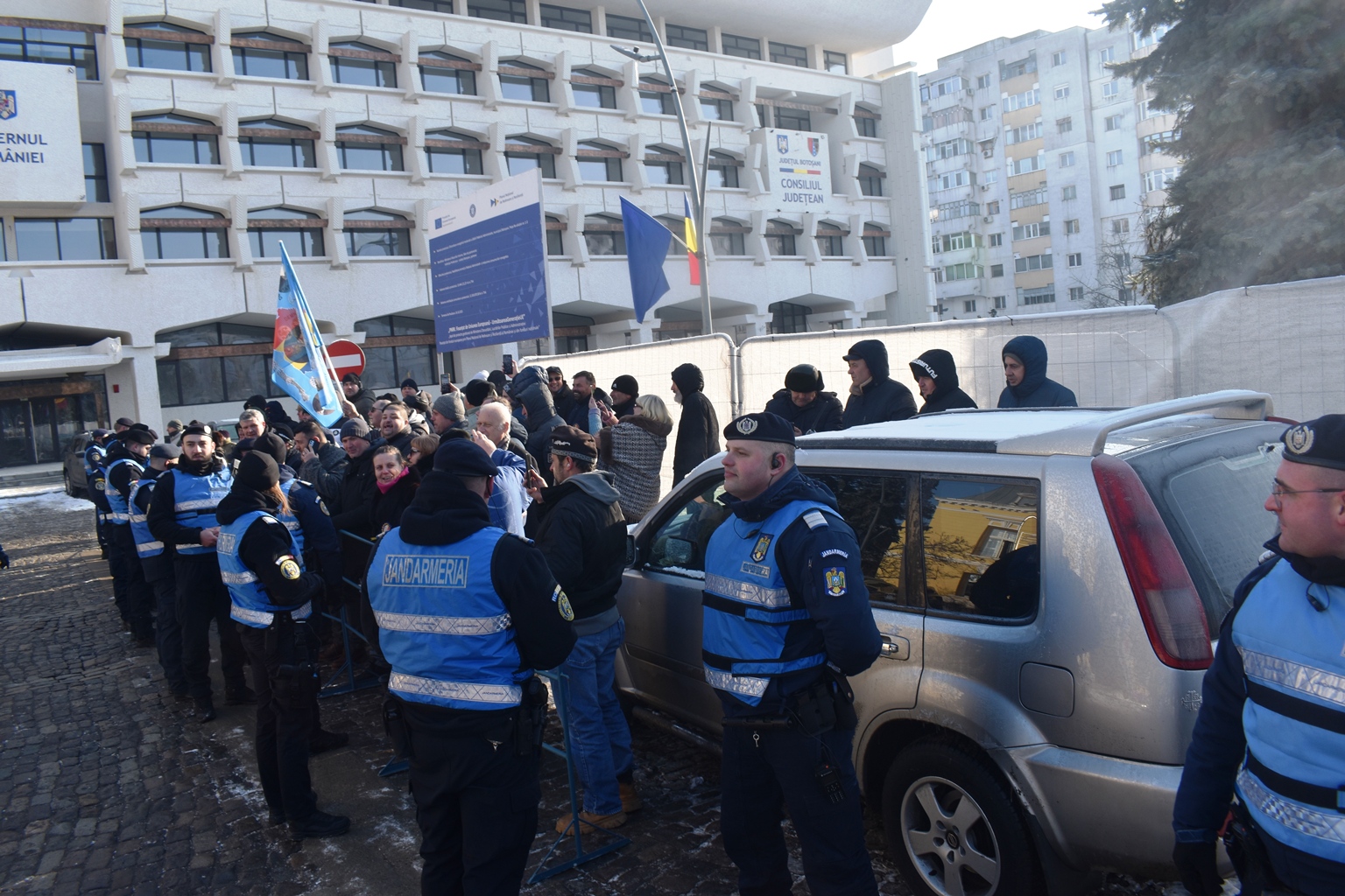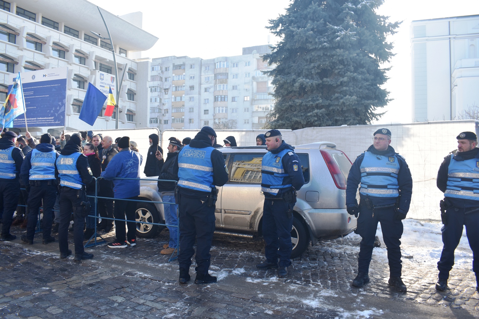 Ca să prevină orice conflict, jandarmii au hotărât să pună garduri, însă cum șoferul încă nu apucase să plece, perimetrul delimitat i-a cuprins și autoturismul.