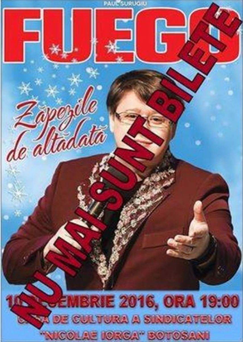 Casa de Cultură a Sindicatelor a detonat bomba care produce tristeţe în rândul miilor de fani din Botoşani: s-au terminat biletele la concertul pe care Fuego îl va susţine pe 10 decembrie la Botoşani.