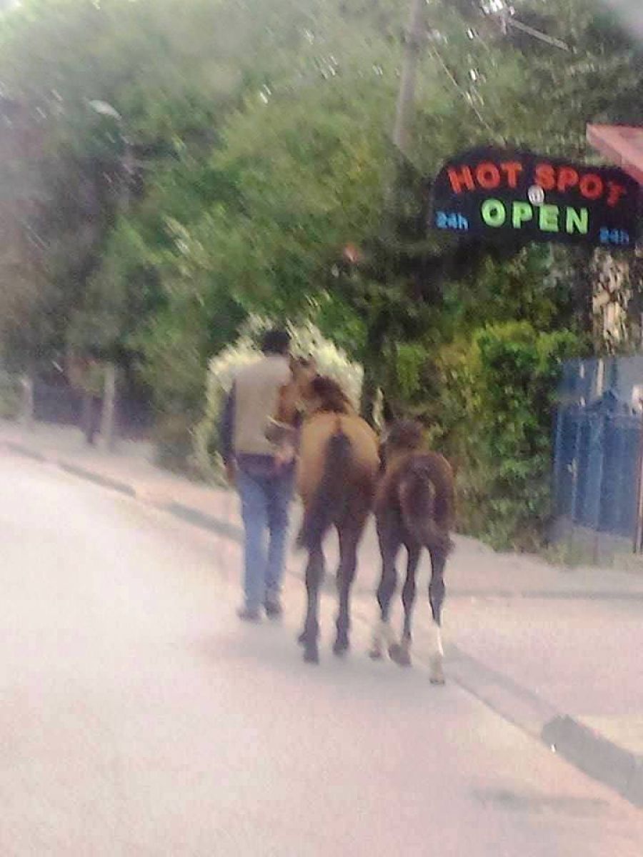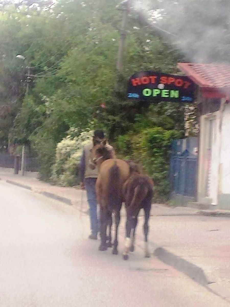 O mulţime de conducători auto care au trecut marţi după-amiază pe strada Nicolae Iorga, s-au apucat de claxonat. Unii de nervi, alţii de uluială, alţii pentru amuzament. Şi asta pentru că undeva în apropierea sediului Inspectoratului Şcolar Judeţean, pe partea carosabilă, un botoşănean îşi plimba tacticos… caii, o iapă şi un mânz, care nu erau legaţi de vreo căruţă sau trăsură, ci erau „ghidaţi” cu ajutorul unei sfori. Proprietarul era foarte distrat şi răspundea cu zâmbete largi celorlalţi participanţi la trafic. (S.B.)