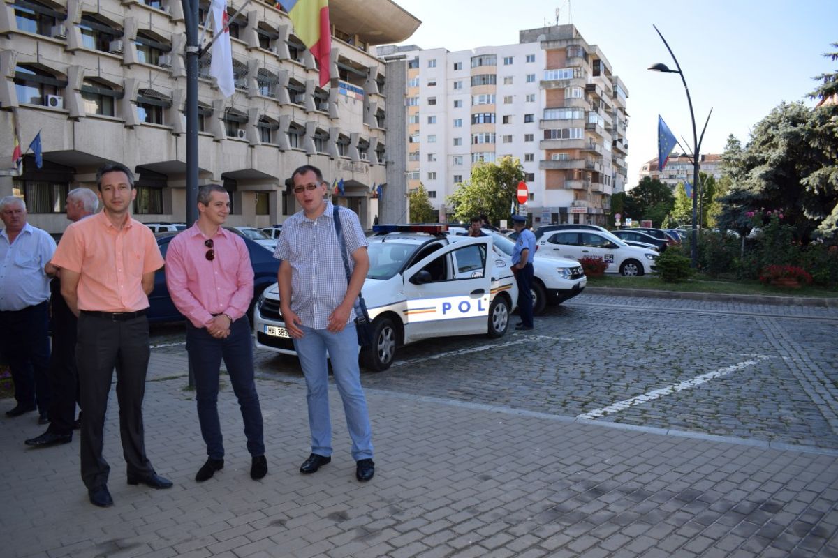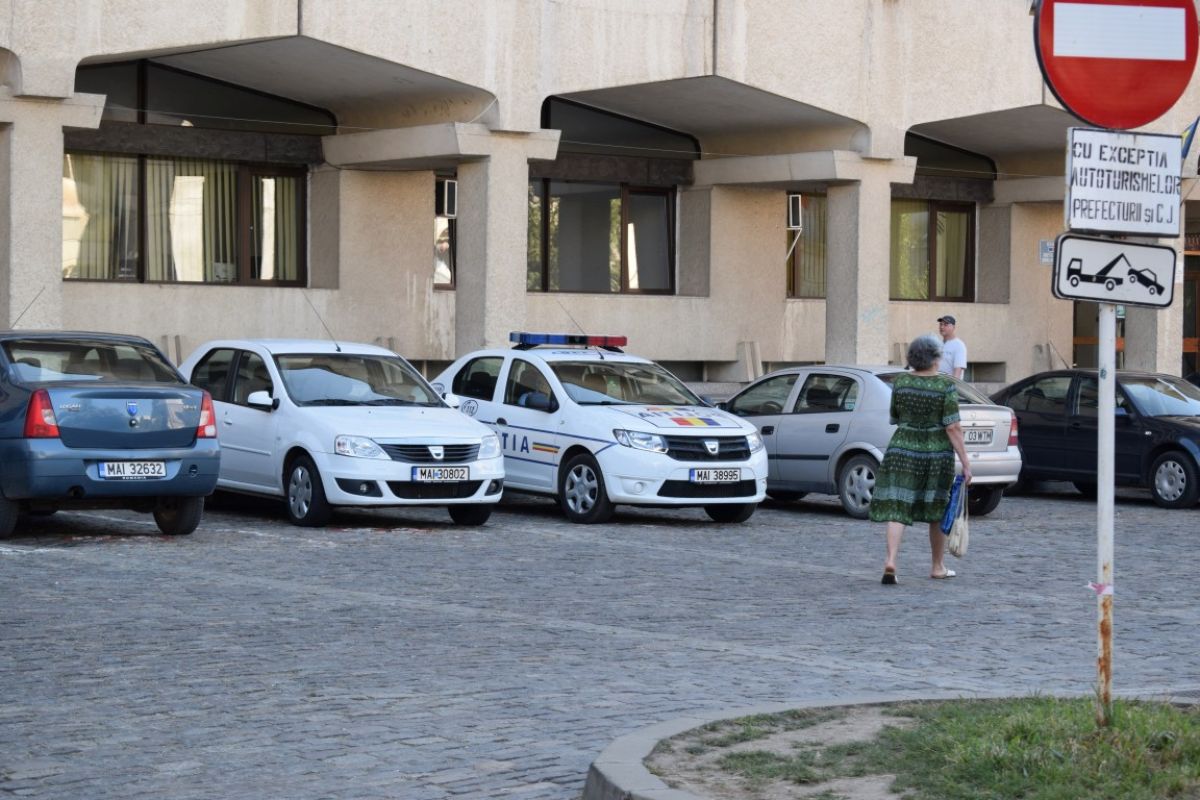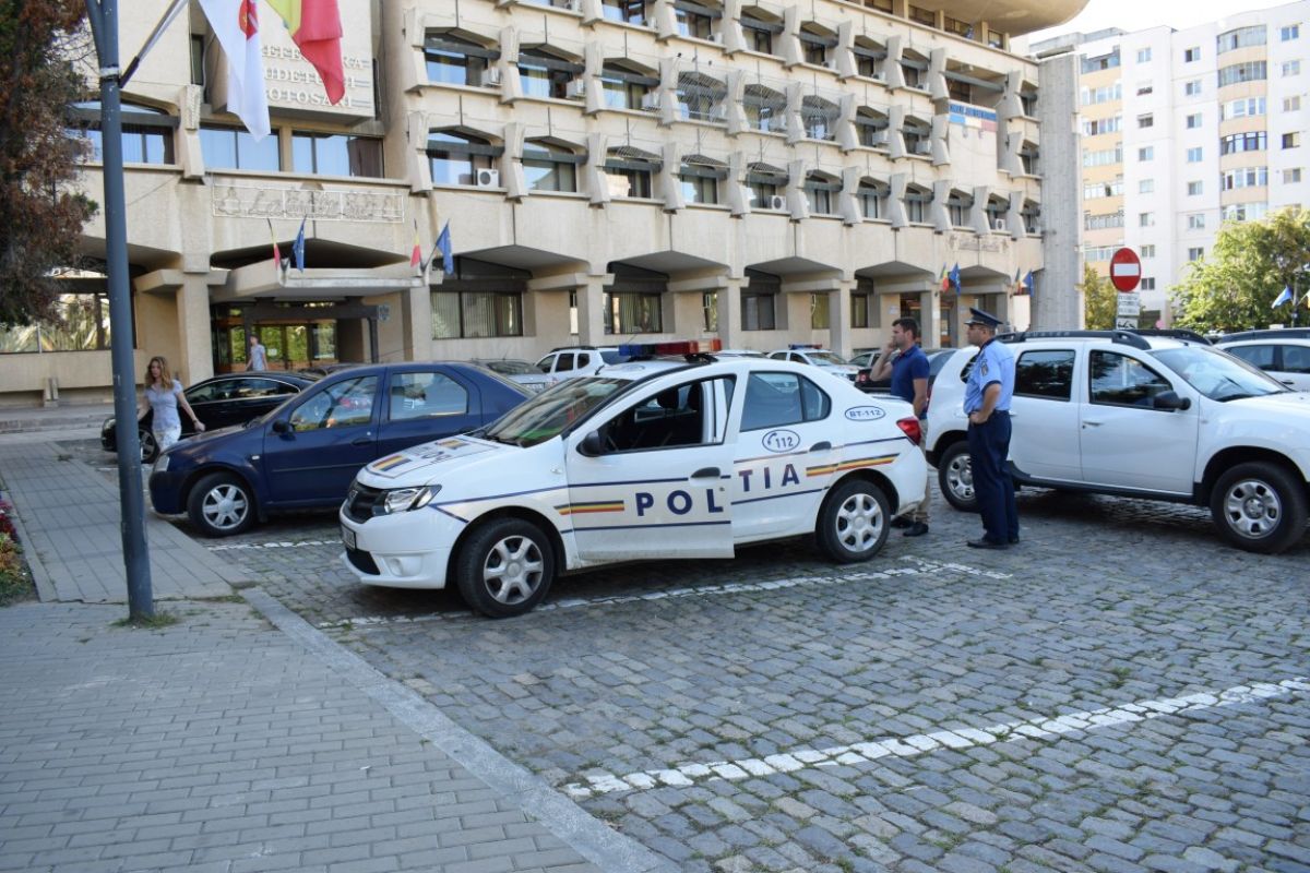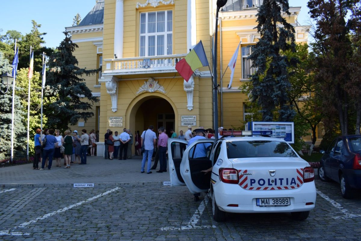 La aproape o oră de când a demarat greva de o zi de la Primăria municipiului reședință de județ, o mașină de Poliție a ajuns în fața instituției.