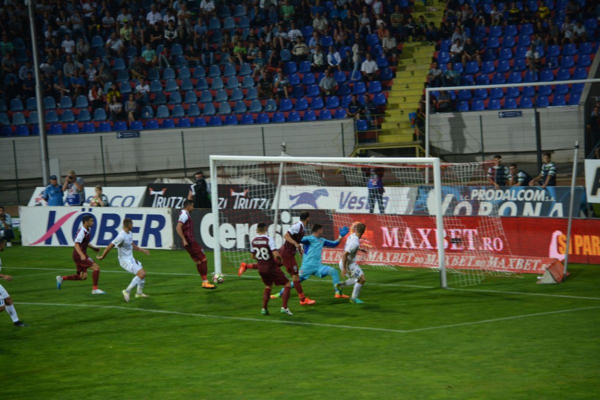 Clujenii au început meciul foarte avântat şi după câteva acţiuni periculoase scorul a fost deschis în minutul 10 de Ovidiu Hoban, care angajat în poziţie centrală a şutat puternic, printre picioarele lui Cobrea.
