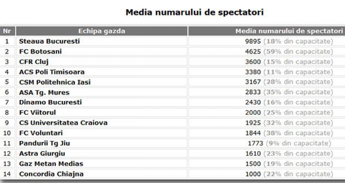FCSB ocupă prima poziţie cu o medie de 9.895 de spectatori, însă aceasta este înşelătoare deoarece se datorează unei asistenţe de peste 27.000 de spectator la meciul cu Dinamo, când în mare parte pe Arena Naţională au fost prezenţi suporterii formaţiei din şoseaua Ştefan cel Mare.