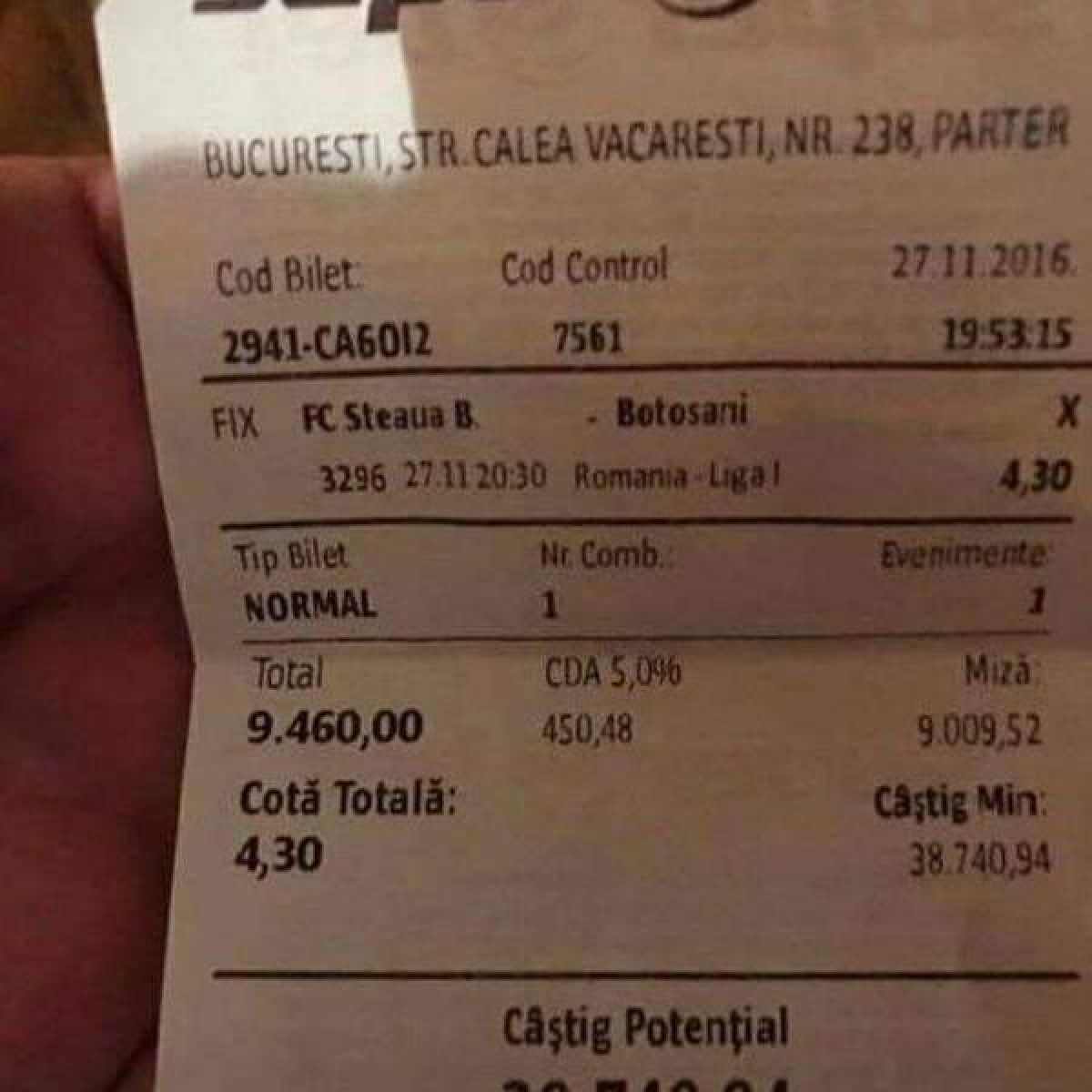 Dacă primul bilet e unul oarecum obişnuit, pariorul dând lovitura cu doar 5 lei mizaţi, al doilea e unul ceva mai serios. Pentru că a avut încredere că elevii lui Laurenţiu Reghecampf nu vor învinge FC Botoşani, dar nici nu a crezut într-o victorie a moldovenilor, pariorul a mizat nu mai puţin de 9460 de lei pe un rezultat de egalitate (cotă 4.3), iar finalul celor 90 de minute l-a găsit în posesia a aproape 40.000 de lei.