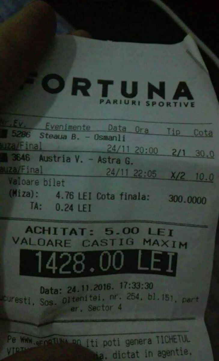 Cota 300, pe care a prins-o prin combinarea pronosticurilor 2 pauză / 1 final la Steaua - Osmanlispor şi X pauză / 2 final la Austria Viena - Astra, nu a rămas o ispravă singulară pentru "eroul" nostru, scriu cei de la Prosport.. Duminică, pariorul a mizat pe un rezultat de egalitate la Steaua - Botoşani, meci terminat 0-0, iar desfăşurarea evenimentelor i-a adus un câştig substanţial: 38.740 de lei.
