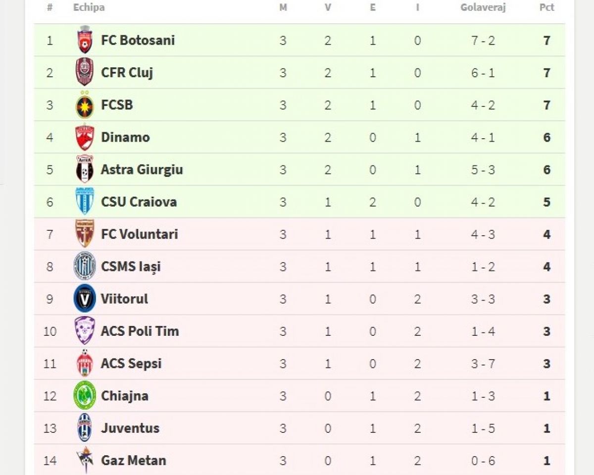 FCSB a făcut doar egal acasă, 1 – 1 cu CSU Craiova, iar CFR Cluj a adunat tot şapte puncte, ca şi roş-alb-albaştrii, are şi aceeaşi diferenţă de golaveraj, +5, numai că FC Botoşani are mai multe goluri marcate, astfel încât a rămas liderul primului eşalon fotbalistic.