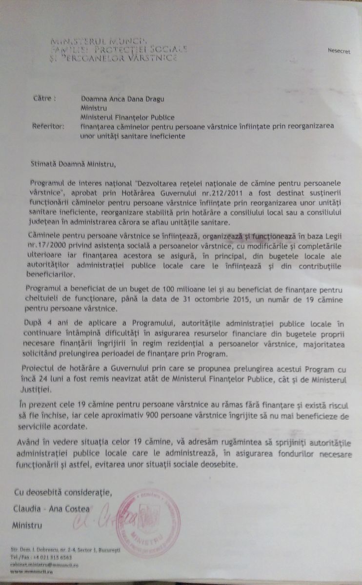 După sesizările și interpelările făcute pe această temă de senatorul Doina Federovici, noul ministru al Muncii a trimis o adresă către Ministerul Finanțelor în care arată că „cele 19 cămine pentru persoane vârstnice au rămas fără finanțare și există riscul să fie închise, iar cele aproximativ 900 de persoane vârstnice îngrijite să nu mai beneficieze de serviciile acordate. Având în vedere situația celor 19 cămine, vă adresăm rugămintea să sprijiniți autoritățile administrației publice locale care le administrează, în asigurarea fondurilor necesare funcționării și astfel, evitarea unor situații sociale deosebite”.