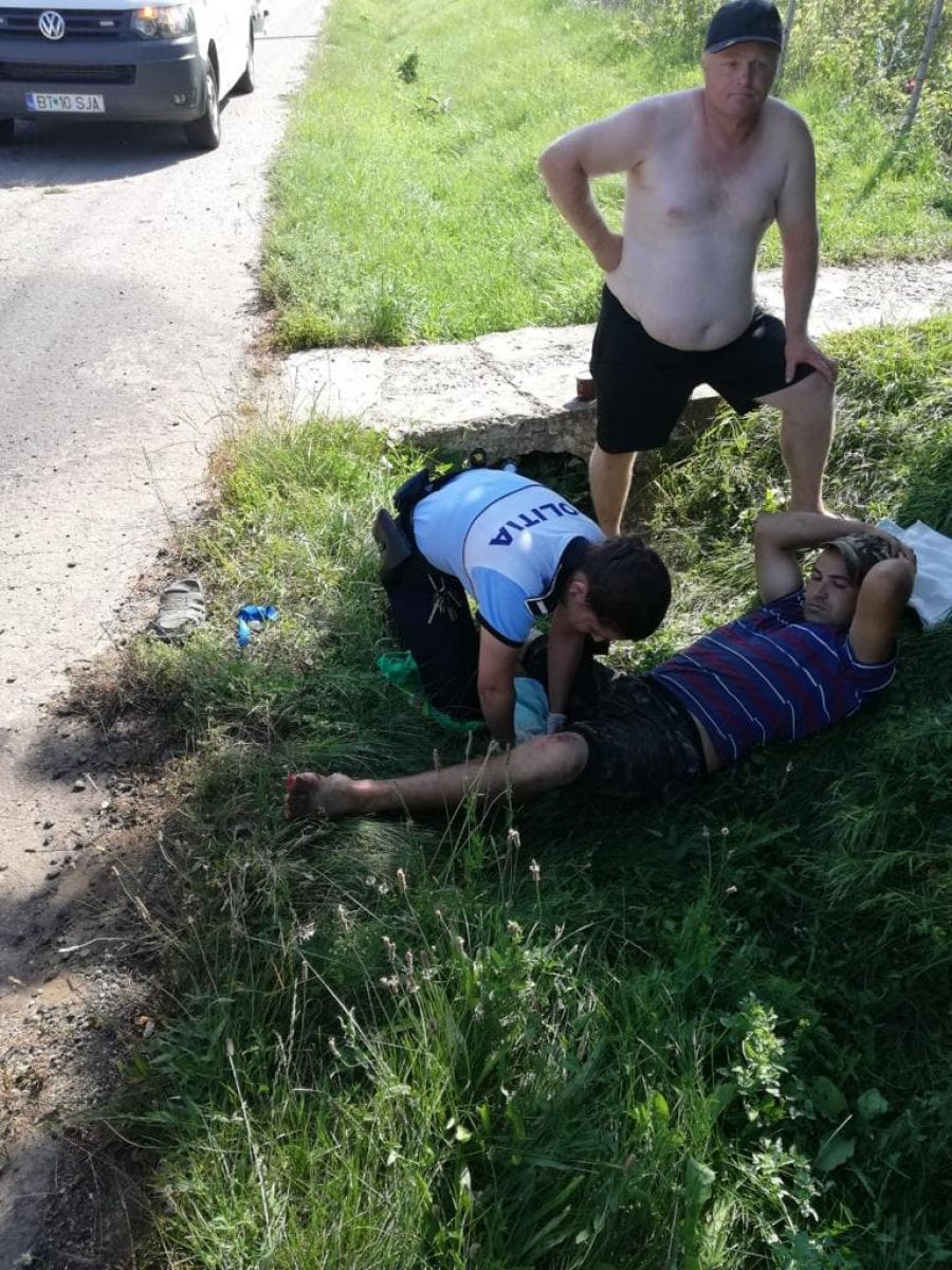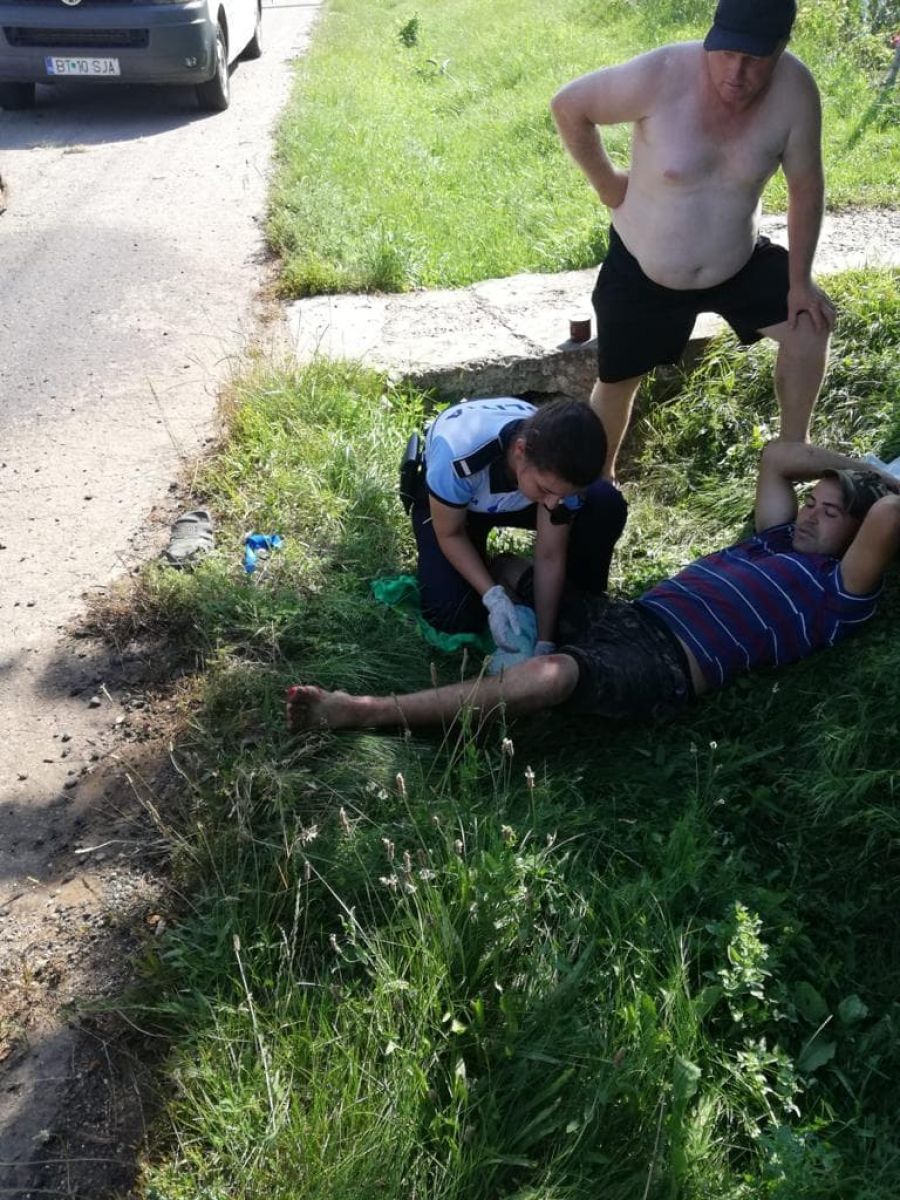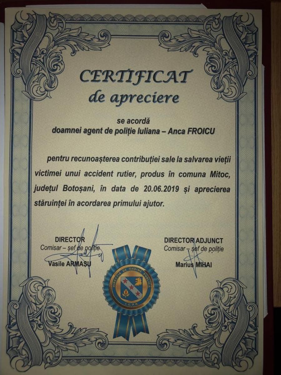 „Am fost solicitați la un eveniment, inițial nu era confirmat ca accident rutier. Dispecerul nostru a avut un fler deosebit și ne-a trimis totuși la fața locului. Ajunși acolo, am găsit un tânăr de 23 de ani care era pe acostament și care spunea că îl doare piciorul stâng. Nu avea nimic la piciorul stâng. În schimb, la piciorul drept avea laba piciorului secționată. Și i-am acordat primul ajutor până la sosirea ambulanței. Eram în localitatea Mitoc, la graniță, ambulanța s-a deplasat destul de greu. I-am salvat viața atunci prin faptul că i-am oprit hemoragia puternică. Sângera foarte tare, am cerut niște prosoape de pe la niște domni, mi-am pus mănușile și am rămas acolo timp de 40 de minute, în aceeași poziție, pentru a nu sângera până la moarte. Ulterior am fost contactați de la Spitalul Mavromati, cu mulțumiri către agenta care a oferit primul ajutor. În caz contrar, tânărul ar fi murit. Hemoragia era foarte puternică, noi efectiv vedeam cum țâșnea sângele. Mai mult i-a fost salvat și piciorul”