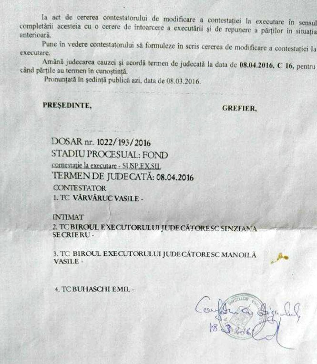 La ultimul termen al procesului în care a avut termen pentru contestația la executare silită, instanța ”Ia act de cererea contestatorului de modificare a contestaţiei la executare în sensul completării acesteia cu o cerere de întoarcere a executării şi de repunere a părţilor în situaţia anterioară. Pune în vedere contestatorului să formuleze în scris cererea de modificare a contestaţiei la executare”.