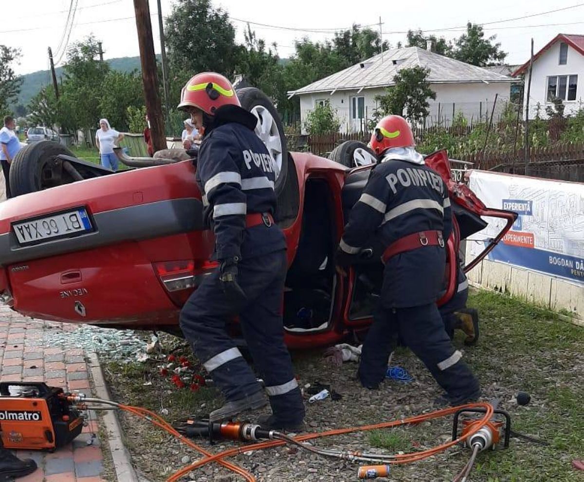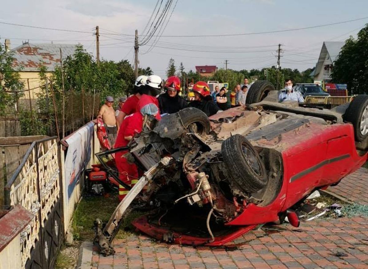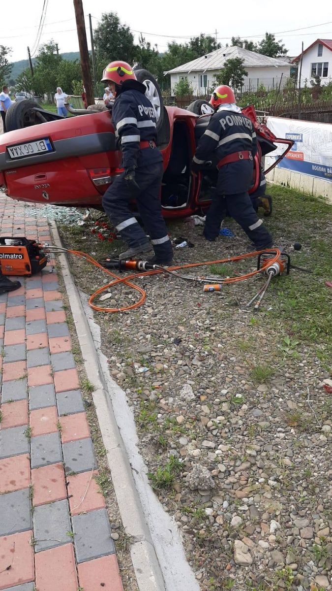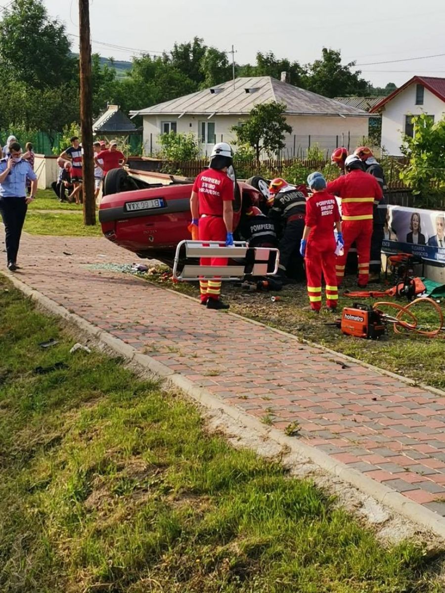 Femeia a rămas blocată în autoturismul care s-a oprit pe cupolă astfel încât Inspectoratul pentru Situații de Urgență a trimis la fața locului echipajul de descarcerare.