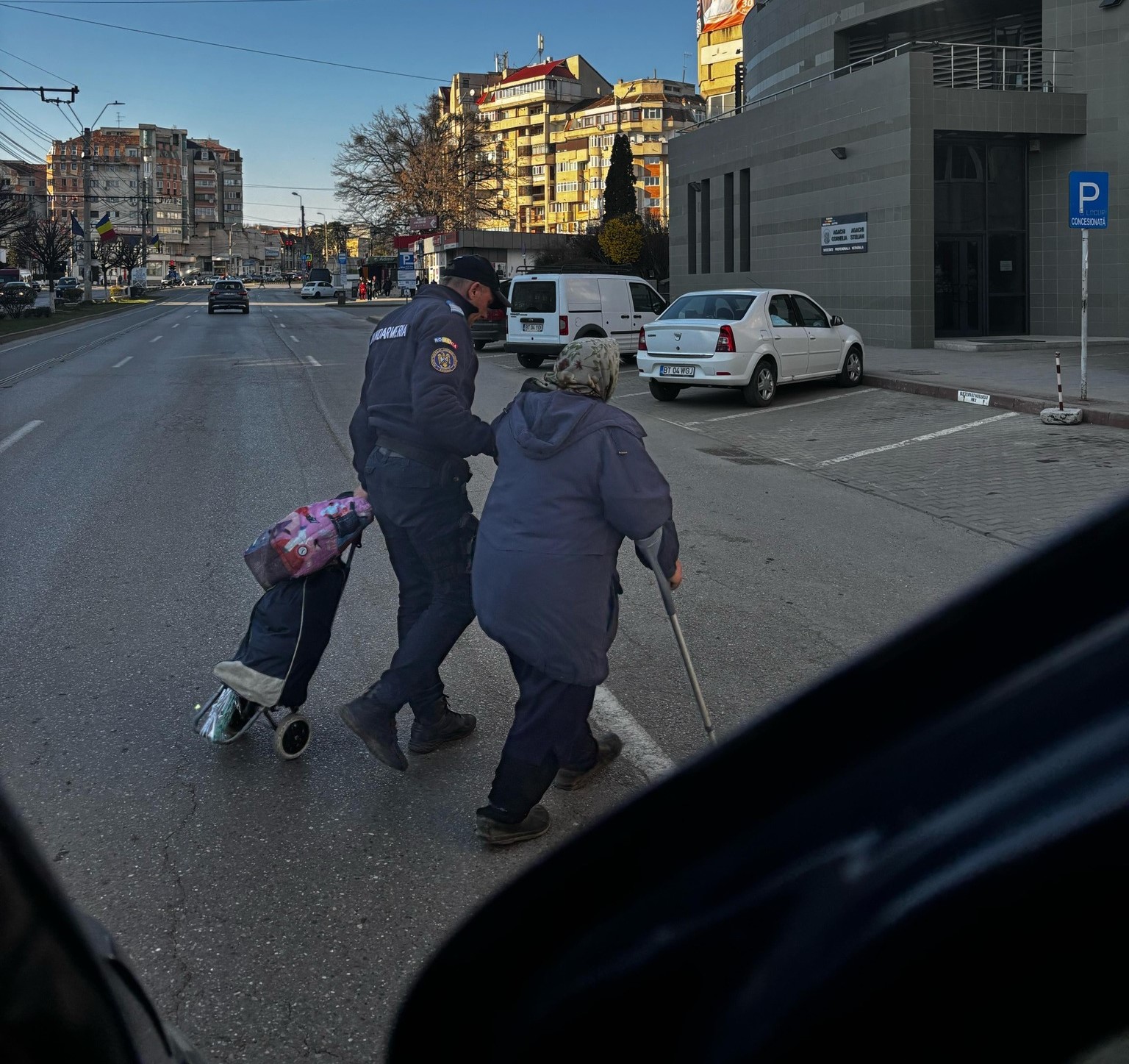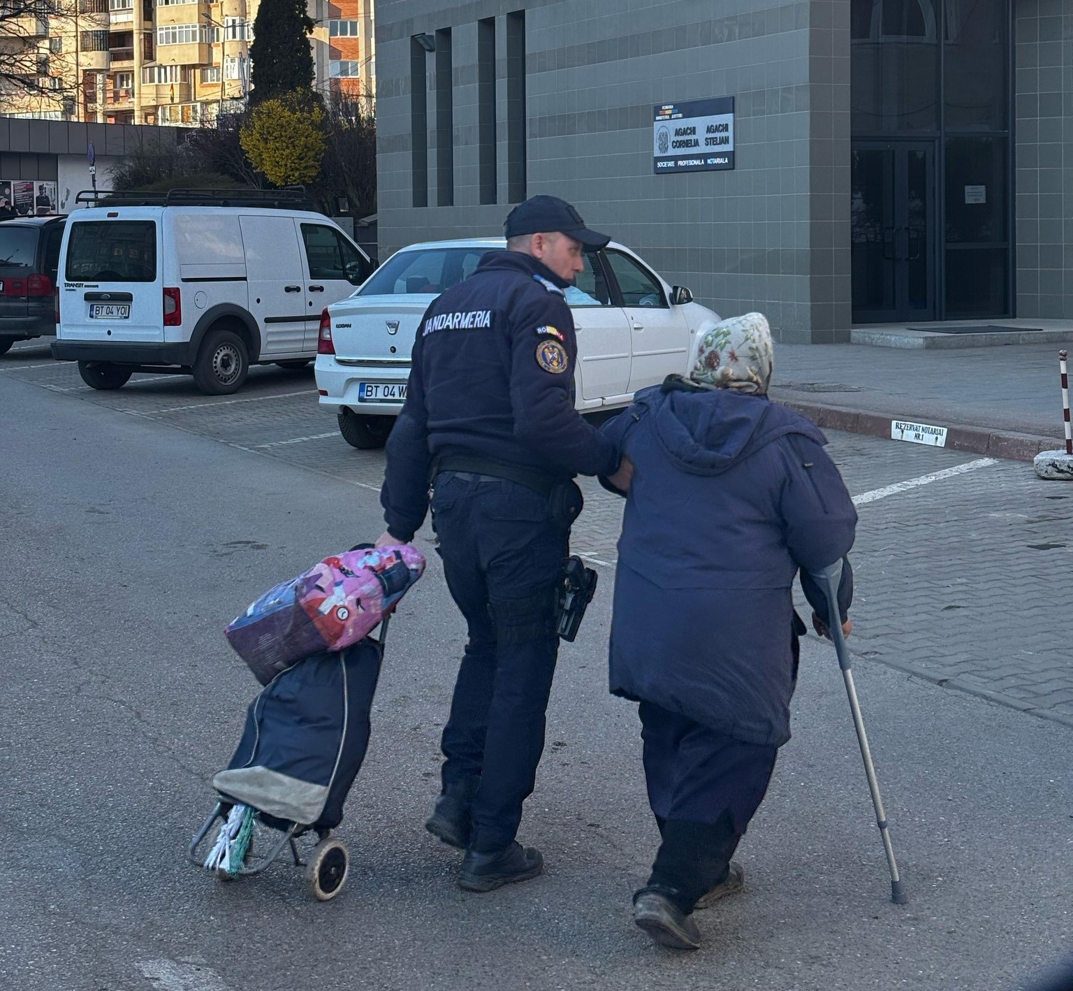 În acel moment, un echipaj de la Jandarmeria Botoșani trecea pe acolo și a ajutat-o pe femeie să traverseze în siguranță.