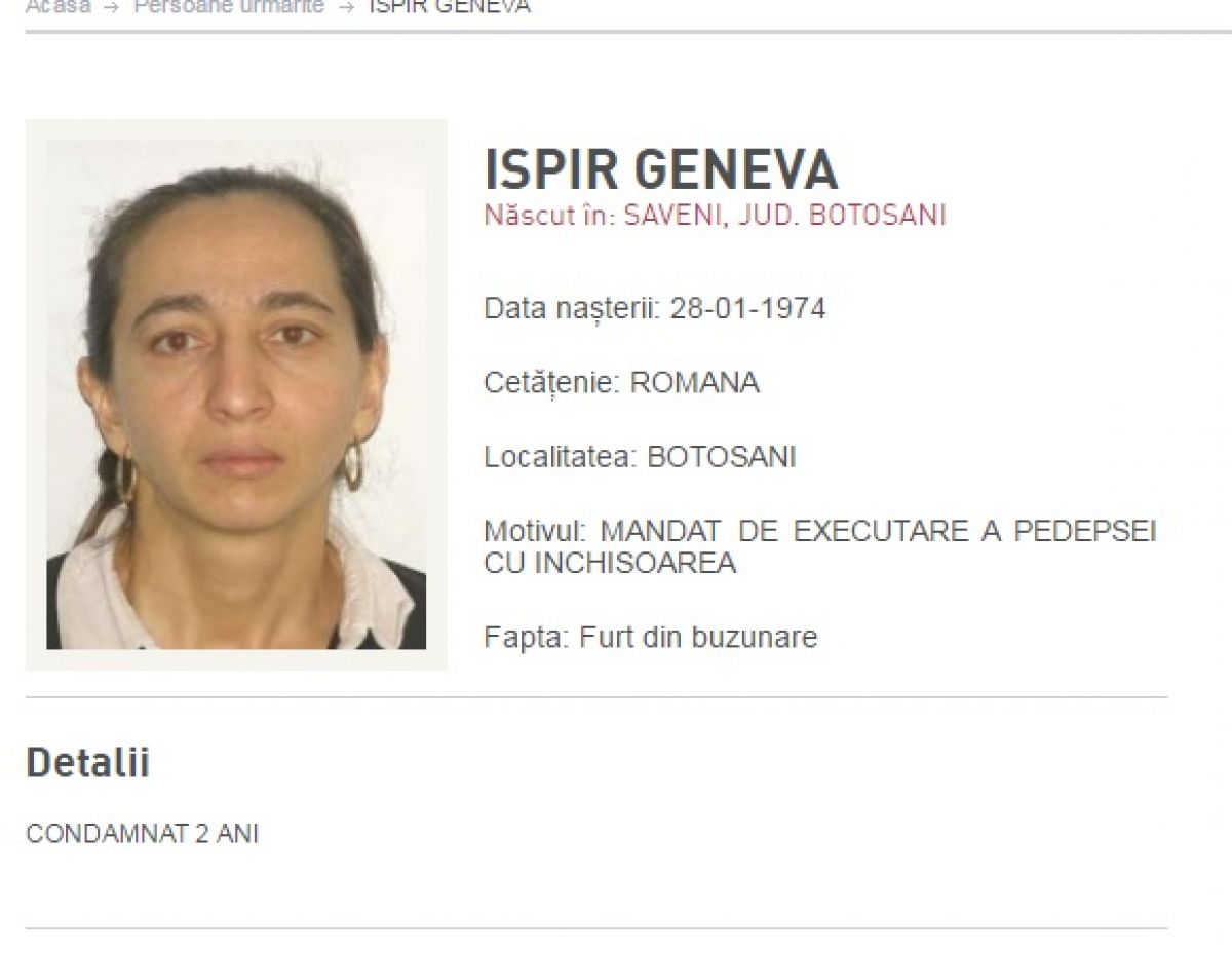 Persoana dată în urmărire națională se numește Ispir Geneva, este născută la data de 28 ianuarie 1974, în orașul Săveni, județul Botoșani. Motivul pentru care femeia apare pe site-ul Poliției Române este acela că pe numele ei a fost emis un mandat de executare a pedepsei de doi ani de închisoare pentru furt din buzunare.