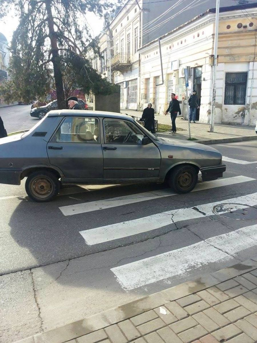 Acestea venea dinspre parcarea amenajată în spatele Bisericii Uspenia și a vrut să facă stânga pe strada Independenței. Chiar în acele momente o pensionară se angajase în traversarea străzii și a fost acroșată de Dacia 1310. Din câte se pare, șoferul era cu privirea în partea dreaptă, spre Biserica Sfântul Spiridon și nu a văzut femeia din stânga sa. Nu avea însă viteză, astfel încât impactul nu a fost unul tocmai puternic. Femeia a căzut, dar a fost ridicată și rezemată de un gard chiar de către conducătorul auto. Mașina acestuia a rămas pe trecerea de pietoni.
