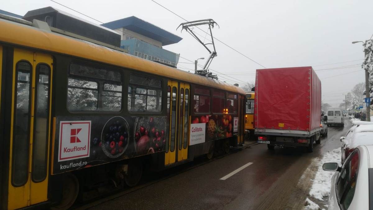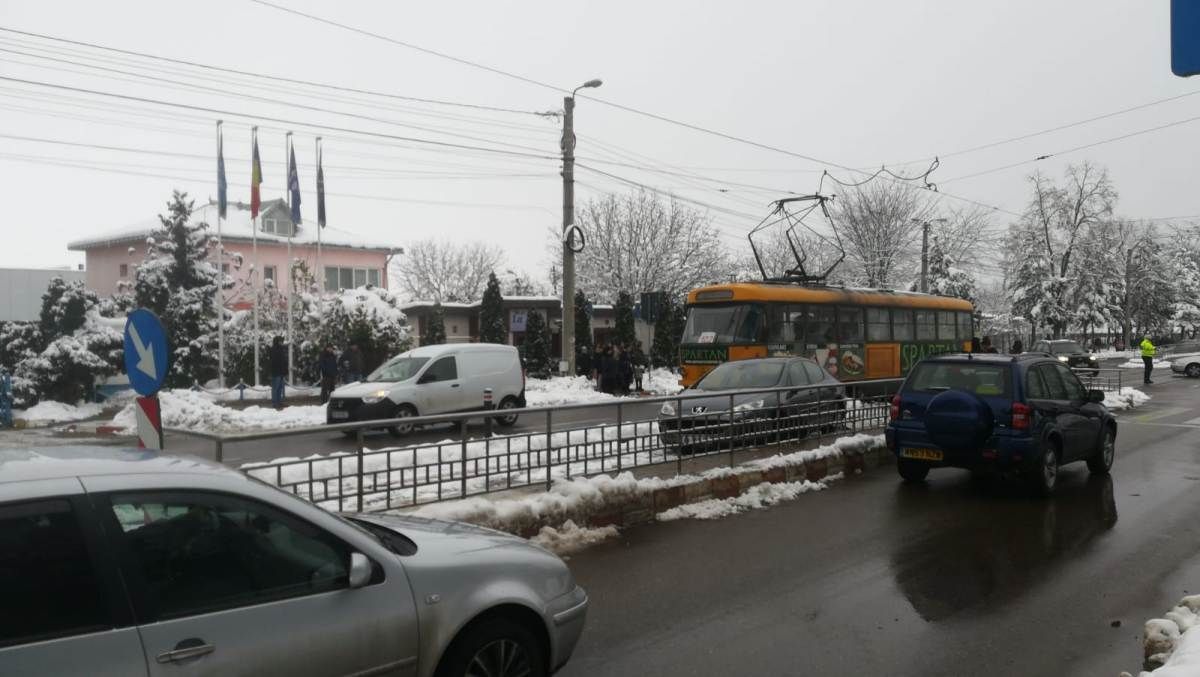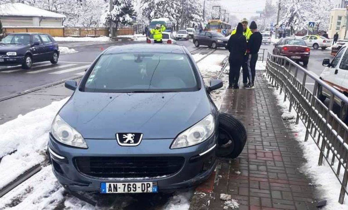 Iar aceasta nu este singura problemă pentru că automobilului i-a sărit o roată şi a rămas blocat pe linia de tramvai.