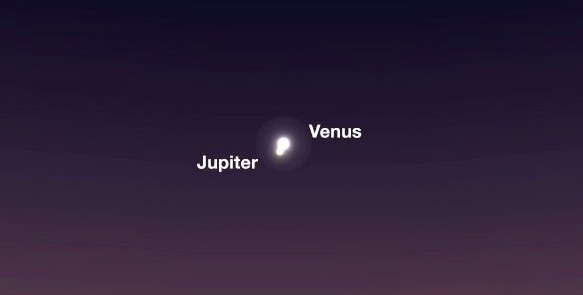 Strălucirea lui Jupiter, cea mai mare planetă, și a lui Venus, cea mai strălucitoare planetă, creează o imagine spectaculoasă.