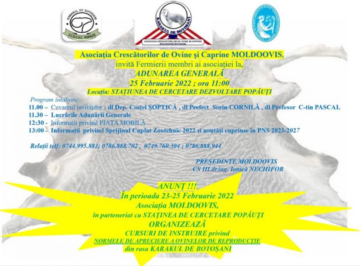 Președintele ACOC Moldoovis, Ionică Nechifor, a anunțat că adunarea generală va fi precedată în perioada 23 – 25 februarie de cursuri de instruire privind normele de apreciere a ovinelor de reproducție din rasa karakul de Botoșani.