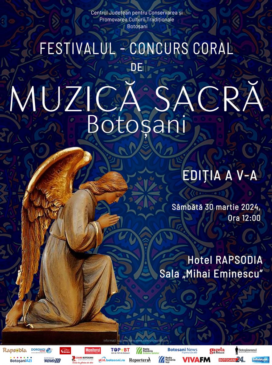În perioada de debut a postului mare, mai exact a doua sâmbătă, pe 30 martie, în călătoria duhovnicească spre Patimi și Înviere, Centrul Județean pentru Conservarea și Promovarea Culturii Tradiționale Botoșani, instituție subordonată Consiliului Județean Botoșani, organizează cea de a V-a ediție a Festivalului-Concurs Coral de Muzică Sacră care va avea loc în sala Mihai Eminescu a Hotelului Rapsodia din Botoșani.