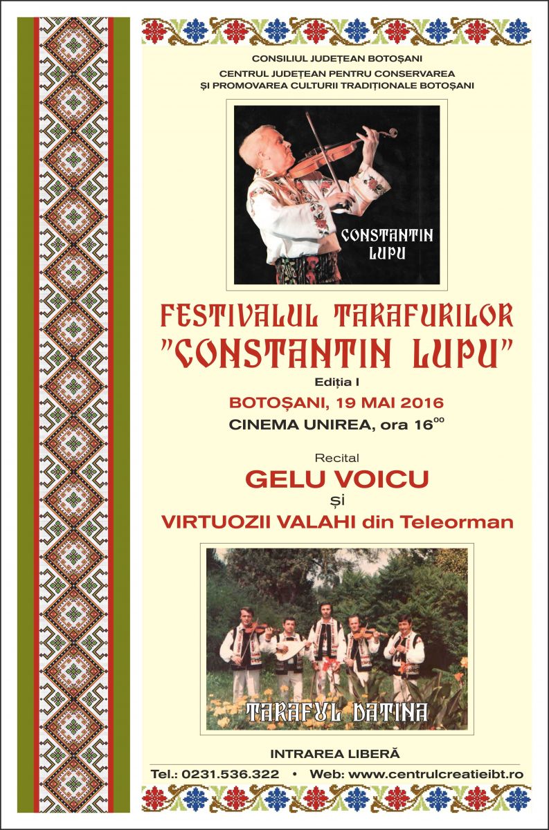Centrul Judeţean pentru Conservarea şi Promovarea Culturii Tradiţionale Botoşani, instituţie de cultură aflată sub patronajul Consiliului Judeţean Botoşani, organizează Festivalul Tarafurilor “Constantin Lupu”.