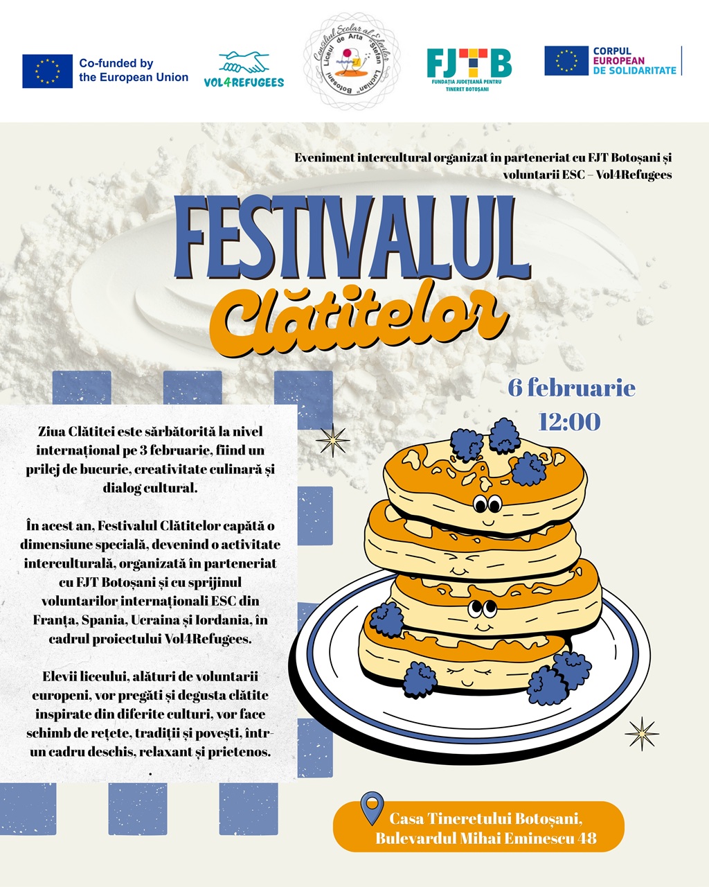Ediția din acest an a Festivalului Clătitelor a fost integrată în proiectul Vol4Refugees și organizată în parteneriat cu FJT Botoșani, cu implicarea la Botoșani.