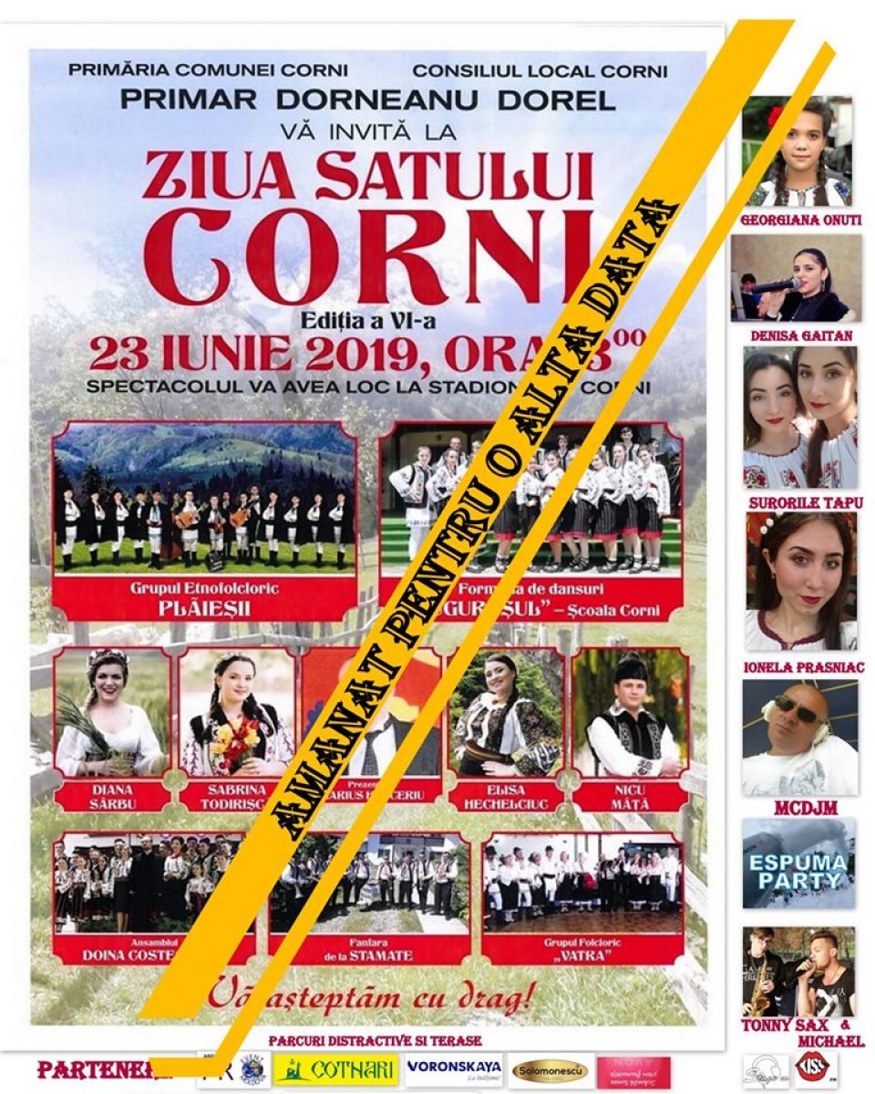 Evenimentul „Ziua Satului Corni” aflat la cea de-a VI-a ediție și care ar fi trebuit să aibă loc pe data de 23 iunie 2019, a fost amânat.