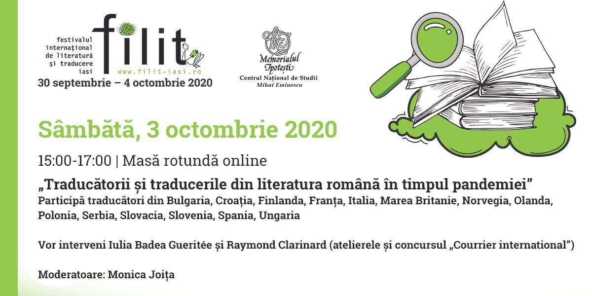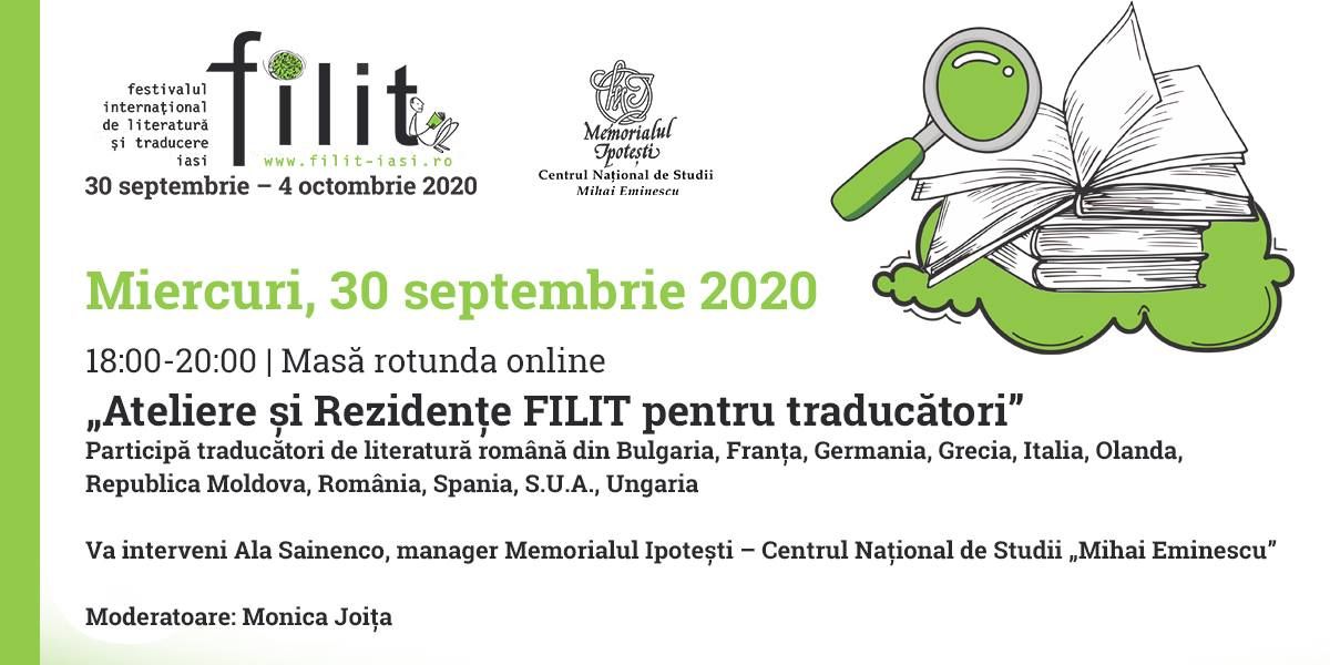 Masa rotundă on-line „Ateliere și rezidențe Filit pentru traducători”, moderată de Monica Joița, se va desfășura în prima zi a Festivalului, pe 30 septembrie 2020, sub semnul Zilei Internaționale a Traducătorilor, între orele 18.00-20.00. La discuții vor participa: Anita N. Bernacchia (Italia), Jan Willem Bos (Olanda), Nicolas Cavaillès (Franța), Jan Cornelius (Germania), Andrew Davidson-Novosivschei (SUA), AntòniaEscandell Tur (Spania), André Ferenc (România), Monica Manolachi (România), Angela Bratsou (Grecia), Florica Ciodaru-Courriol (Franța), RikKießling (Germania), GabriellaKoszta (Ungaria), Monica Moroșanu (România), Lora Nenkovska (Bulgaria), Paula Onofrei (România), Ivan Pilchin (Republica Moldova), Mihaela Anițului, Ala Sainenco, Lucia Țurcanu (Memorialului Ipotești – Centrul Național de Studii Mihai Eminescu).