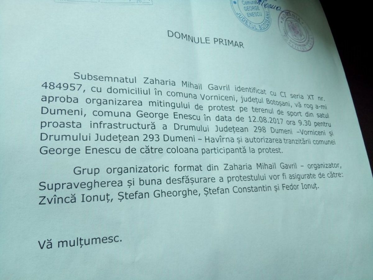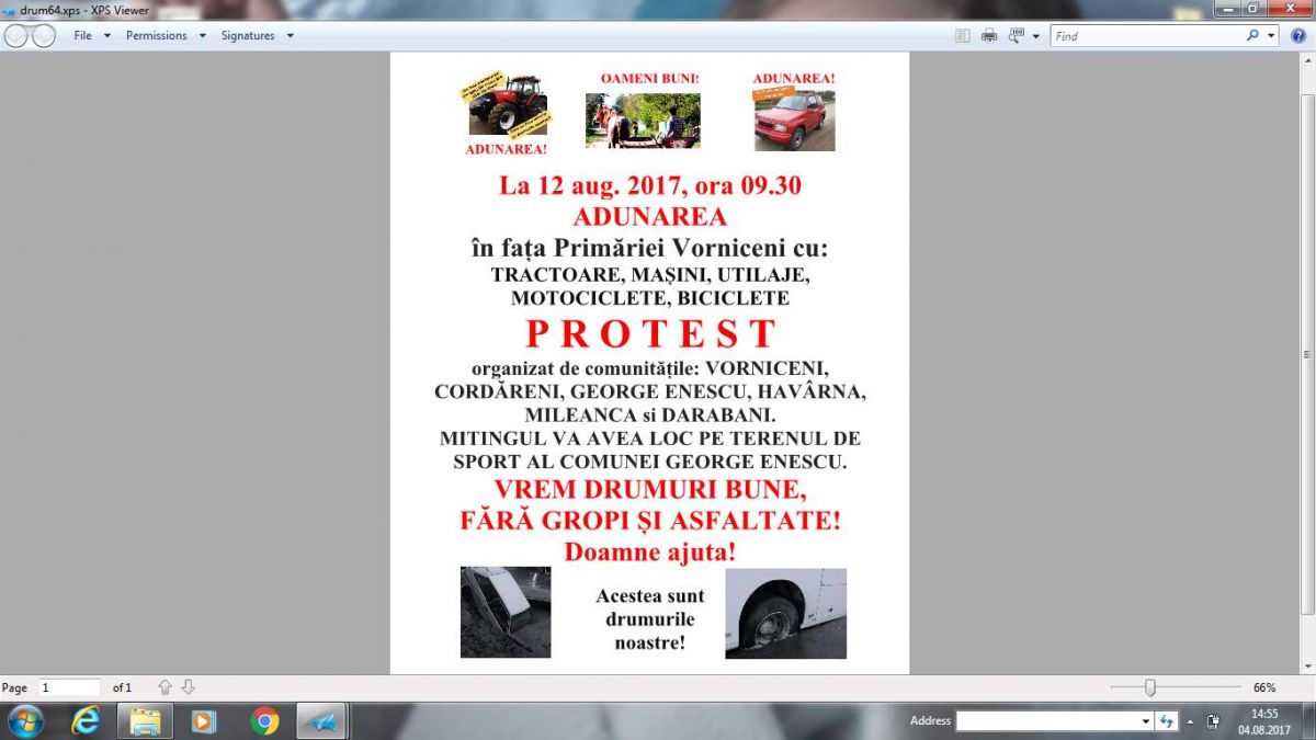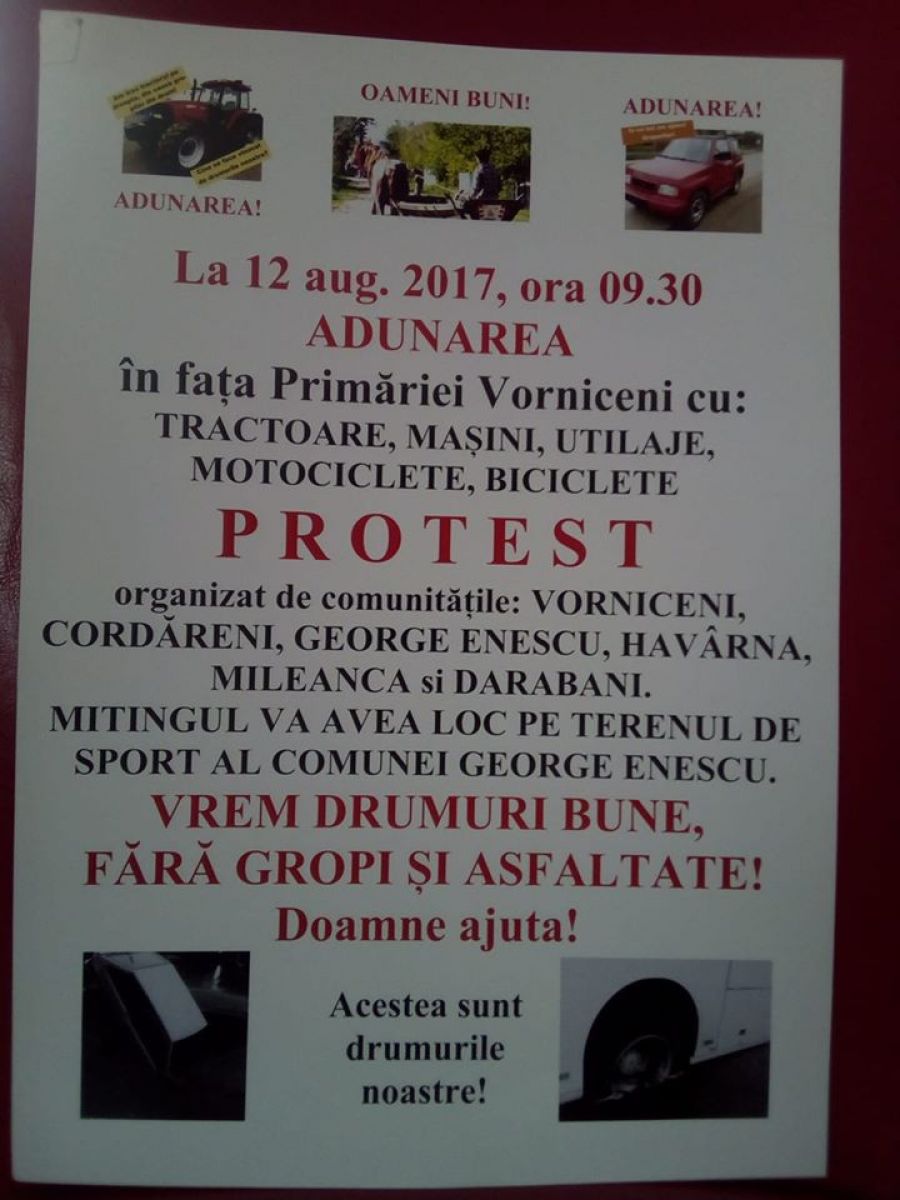 ”Va urma mitingul de protest de la ora 11.00 pe terenul de sport din Cracalia comuna George Enescu. În aceeași zi, sâmbătă 12 august 2017 la ora 9.30- din Vorniceni va porni coloana manifestanților din Vorniceni și Nicșeni pe DJ 298A spre Cordăreni,unde se face joncțiunea cu manifestanții din Cordăreni apoi se urmează traseul pe DJ 298 A până la Cracalia, George Enescu, unde la ora 11.00 vor participa la mitingul de protest”,