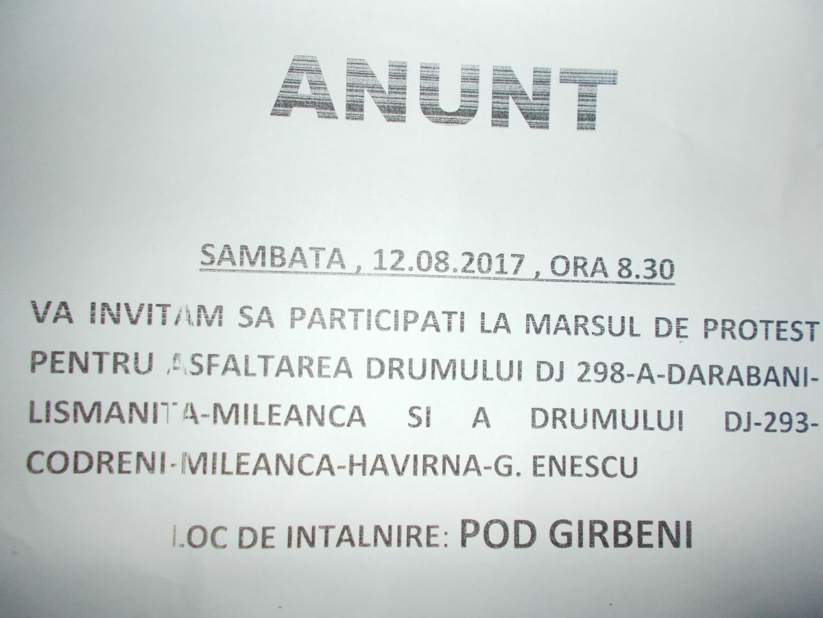 Astfel la ora 9.30 o coloană cu manifestanți va pleca din orașul Darabani pe DJ 298 A spre Lișmănița - Mileanca.