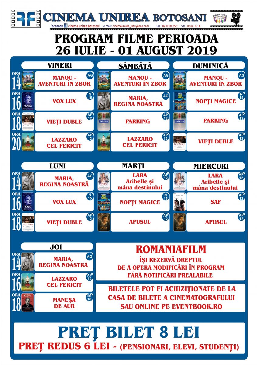Cinema Unirea Botoșani anunță programul pentru weekend și săptămâna următoare, oferta fiind una pentru toate gusturile. Iubitorii de film îl mai pot vedea încă și pe Vlad Ivanov în recenta peliculă premiată internațional, ”Apusul”. Peste doar câteva zile, actorul va primi titlul de Cetățean de Onoare al orașului natal, eveniment care vine să îl sărbătorească pe Vlad Ivanov chiar la împlinirea vârstei de 50 de ani.