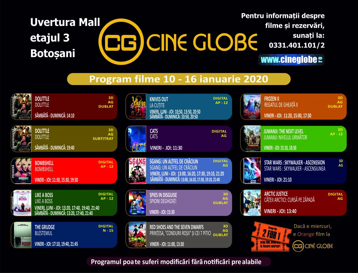 Filme pentru toate gusturile, începând din 10 ianuarie, la Cine Globe Botoșani. De la ”Dolittle” la ”Cats”, de la ”Spioni deghizați” la ”Blestemul”, producțiile sunt alese atât pentru copii, cât și pentru părinți.