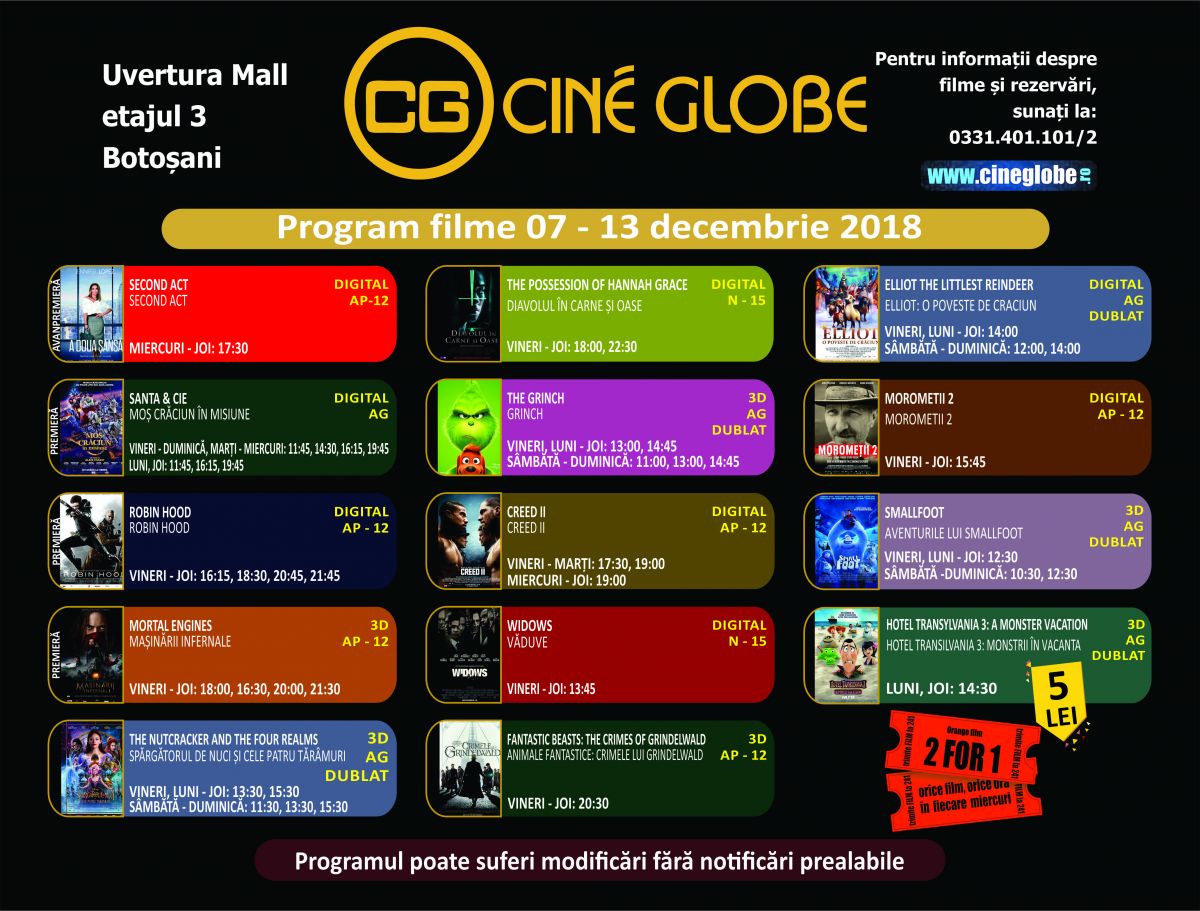 Reprezentanții singurului multiplex de la Botoșani, aflat în incinta Uvertura Mall au transmis programul de difuzare pentru săptămâna 7- 3 decembrie 2018.