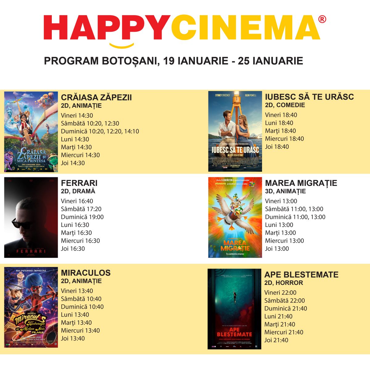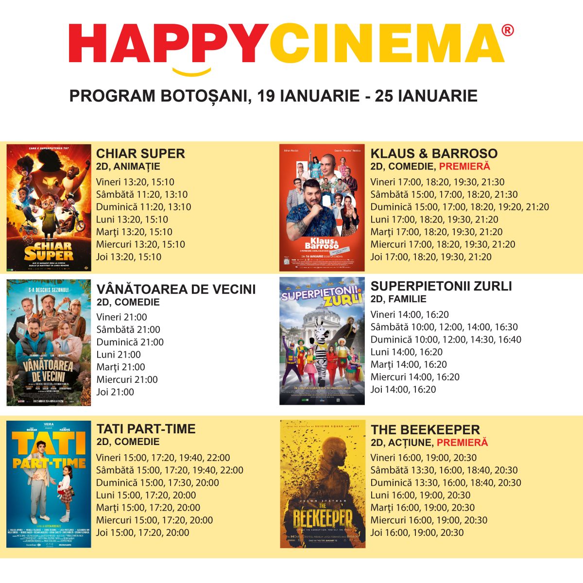 Happy Cinema Botoșani a transmis programul filmelor care rulează în săptămâna 19 – 25 ianuarie 2024.