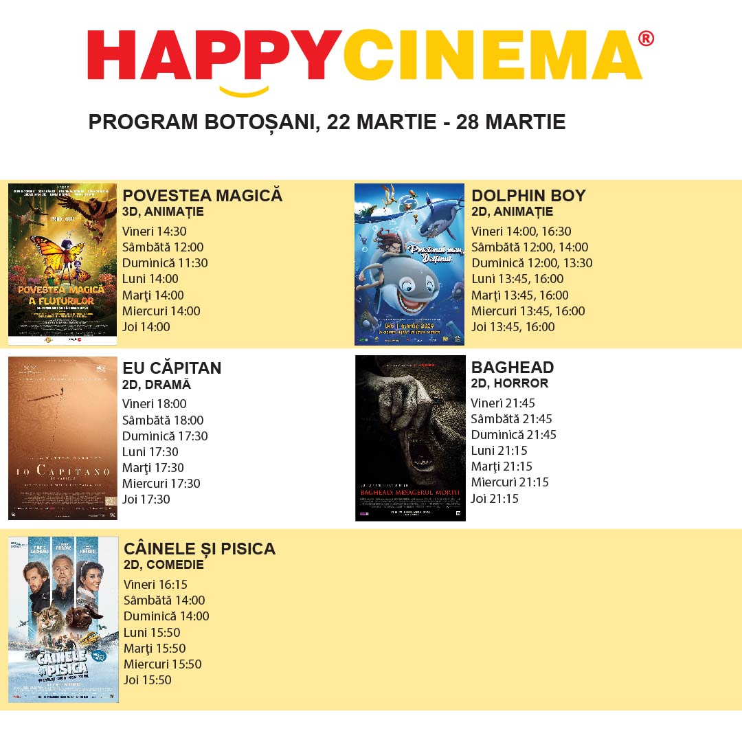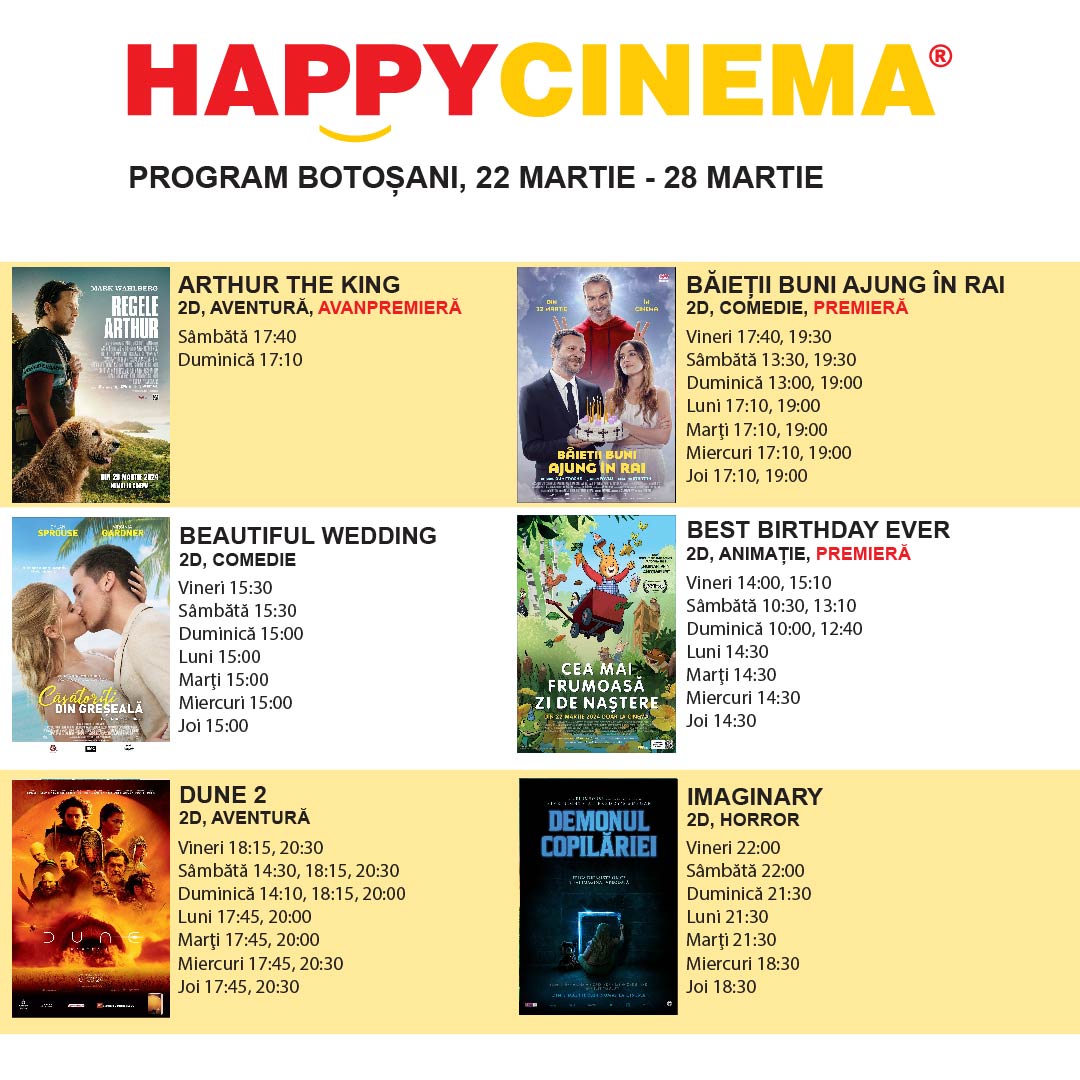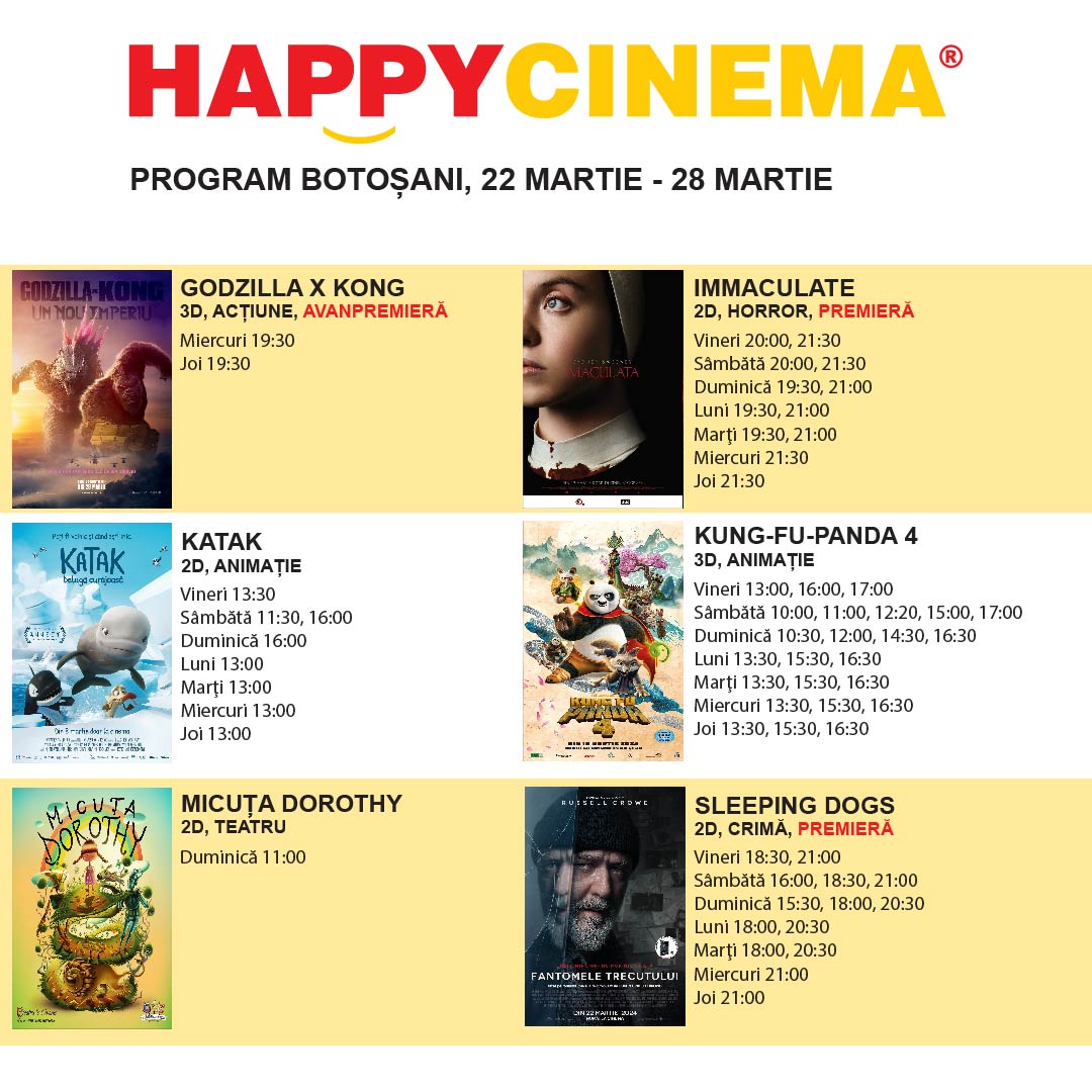 Happy Cinema Botoșani a transmis programul pentru săptămâna 22 -28 martie 2024.