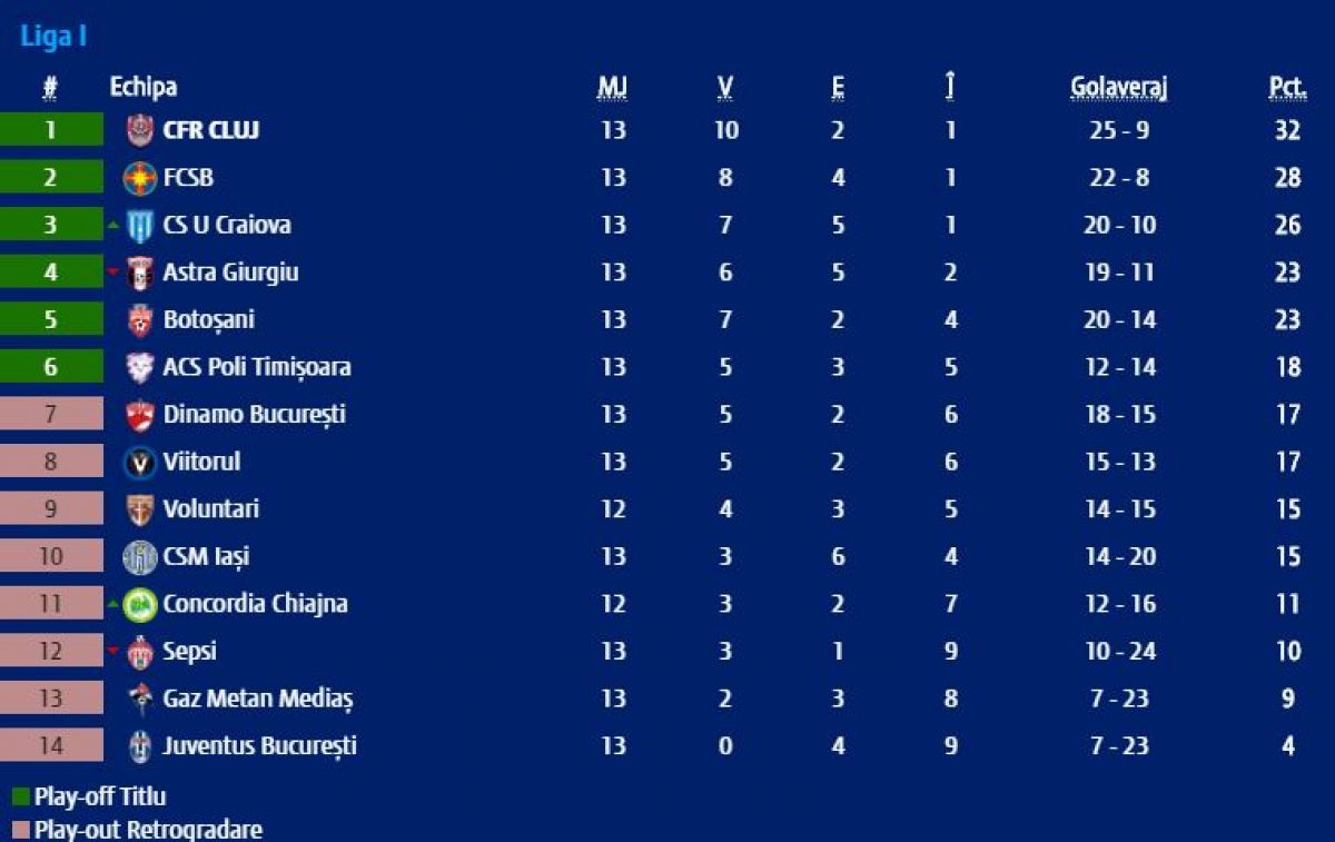 Marea revelaţie a toamnei poate fi considerată atât liderul Ligii 1, CFR Cluj, cât și Astra Giurgiu. Echipa condusă de Dan Petrescu a încheiat turul în fruntea Ligii 1 şi poate fi considerată fără doar și poate una dintre principalele candidatele la titlu. Clujenii au încheiat turul cu zece victorii, două rezultate de egalitate și o înfrângere. De partea cealaltă, așa cum aminteam mai sus, Astra a avut un parcurs surprinzător după ce în vară giurgiuvenii s-au despărțit de majoritatea jucătorilor pe care îi avea și de tehnicianul Marius Șumudică. Campioana de acum două ediții se află pe poziția a patra, cu șase victorii, cinci rezultate de egalitate, dar și două înfrângeri.
