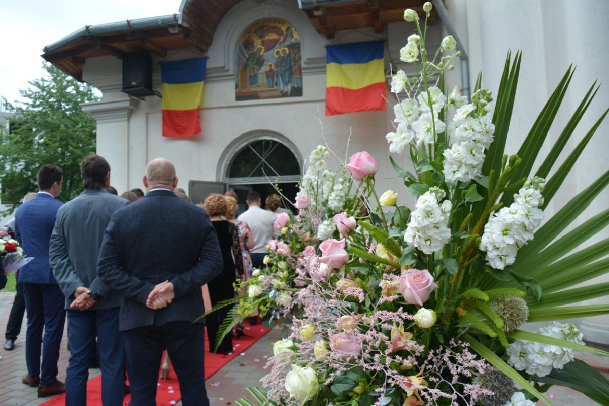 În curtea lăcașului de cult au fost întâmpinați de deputată și de directorul Liceului cu Program Sportiv, dar și de vicepreședintele Consiliului Județean, Liviu Toma, împreună cu soția sa, Anca, director la Școala Gimnazială Sfântul Nicolae.