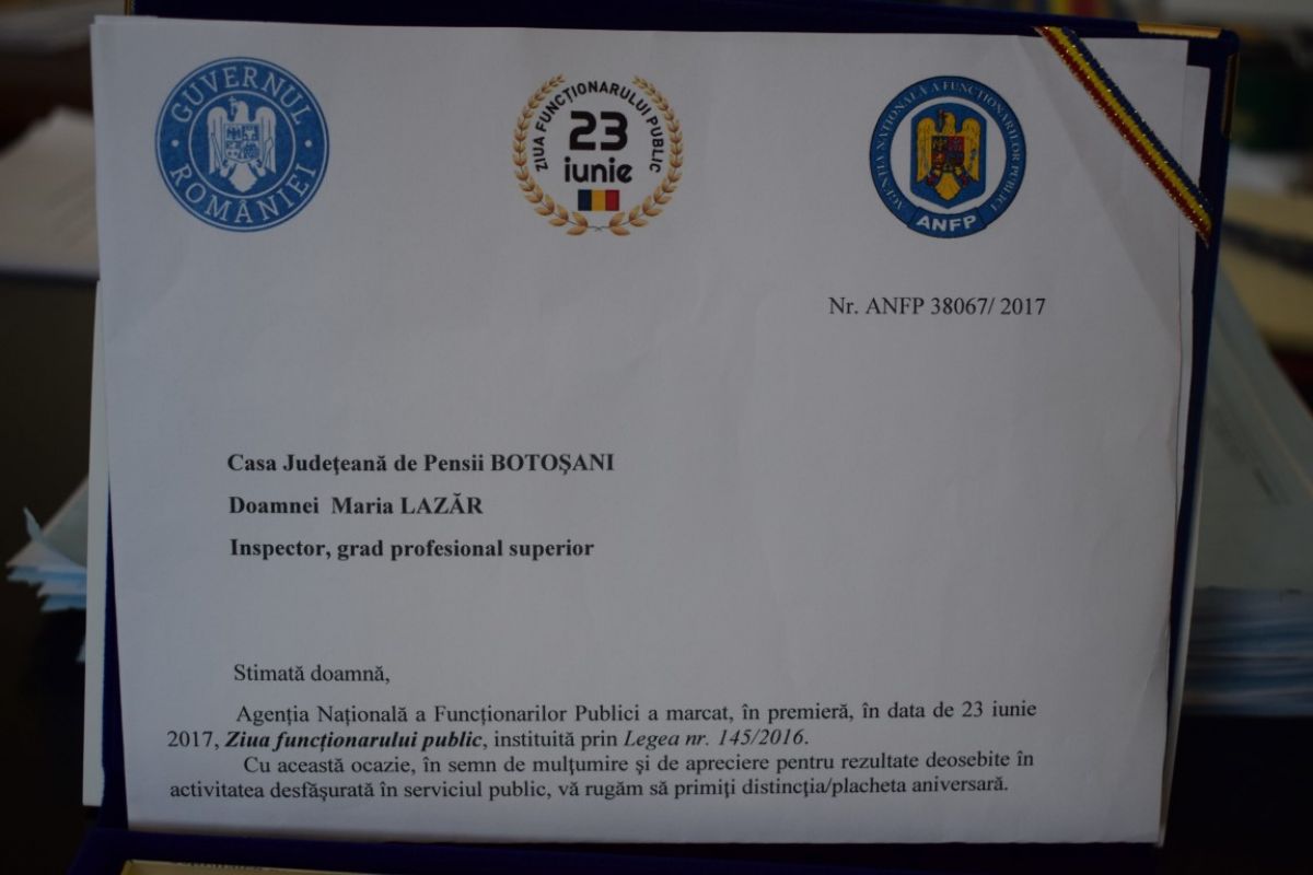 ”Am primit o solicitare de la ANFP și noi am votat în Consiliul Director, am avut vreo trei, patru persoane propuse, doamna a avut cele mai multe voturi. La nivelul țării 15 persoane au obținut acest titlu. Este o cinste pentru noi să avem așa o persoană, practic a primit voturi din toată țara, a fost singura persoană selectată de la casele de pensii din întreaga țară”,
