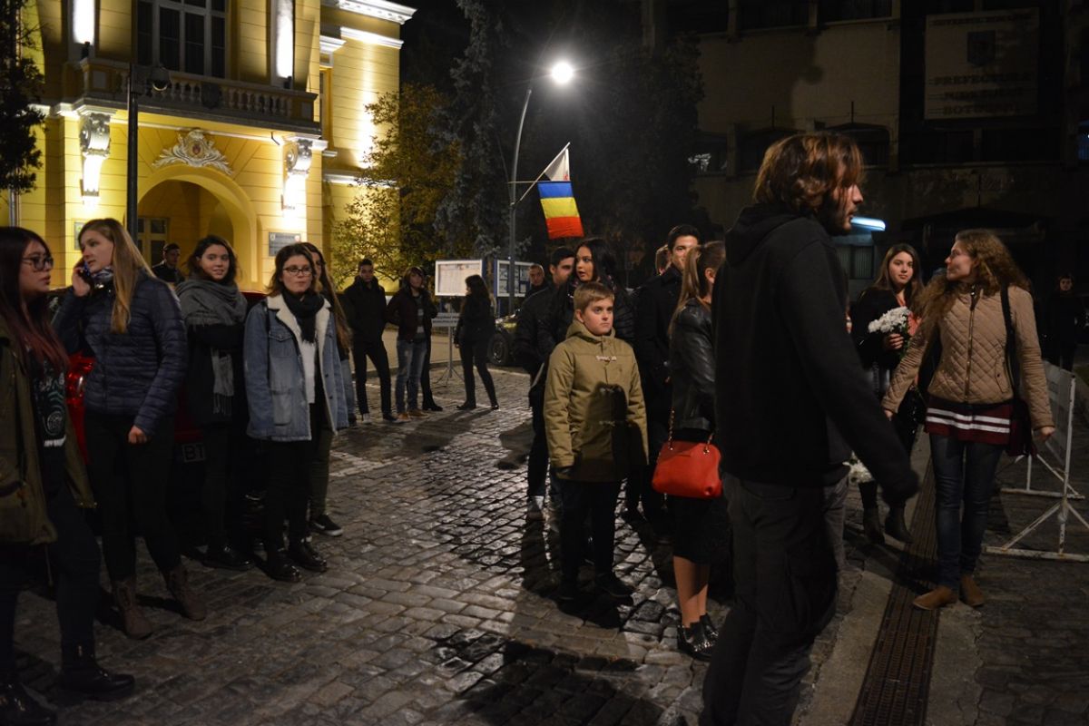 Peste 50 de botoșăneni s-au strâns sâmbătă seara în Piața Revoluției pentru a comemora victimele tragicului eveniment de la clubul Colectiv din București. Au venit cu flori și lumânări pe care le-au aprins în fața intrării principale din Primăria Botoșani.