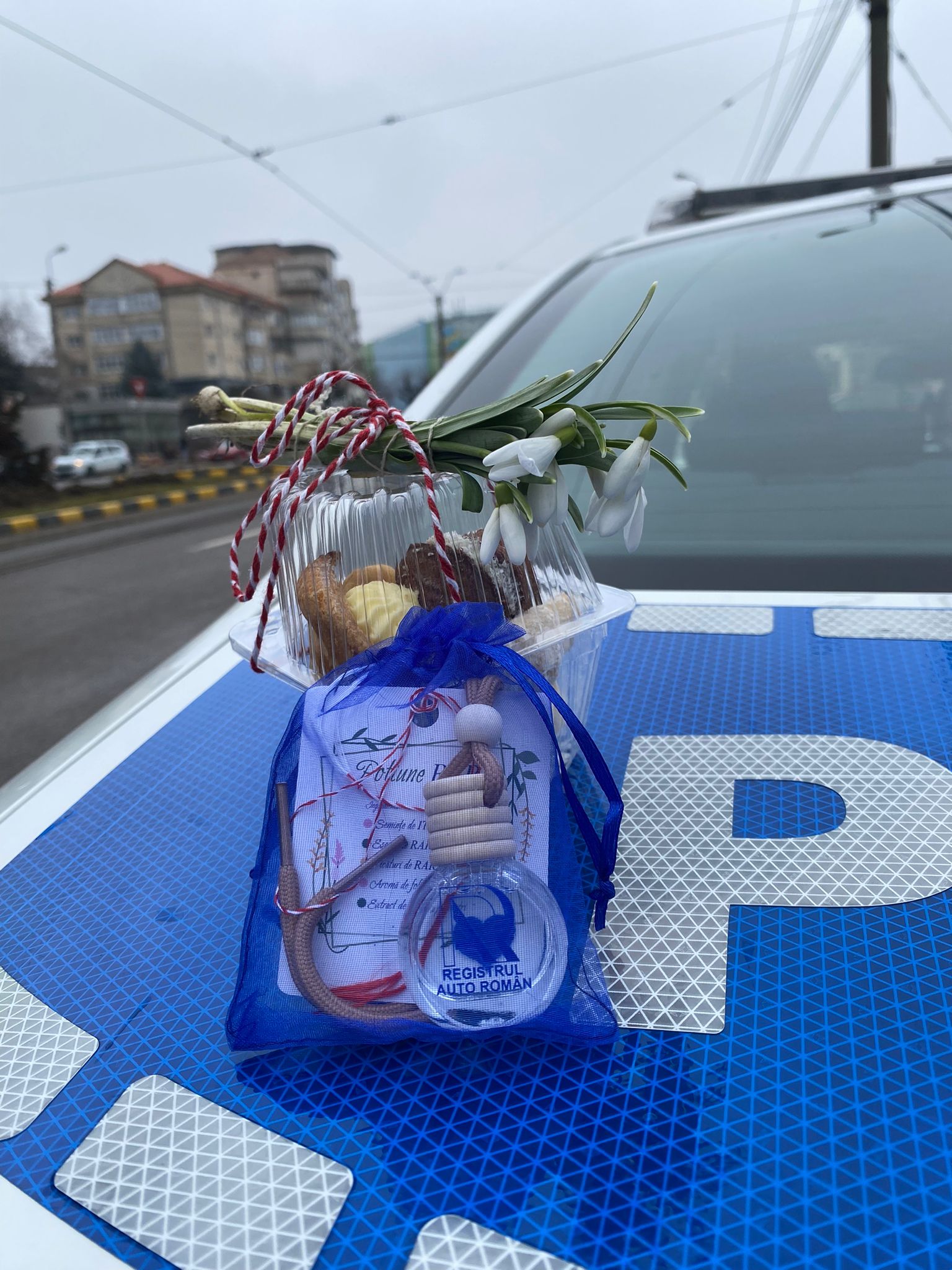 Cu ocazia zilei de 1 Martie, polițiștii din cadrul Serviciului Rutier, împreună cu reprezentanții Registrului Auto Român au oferit doamnelor și domnișoarelor întâlnite în trafic mărțișoare.