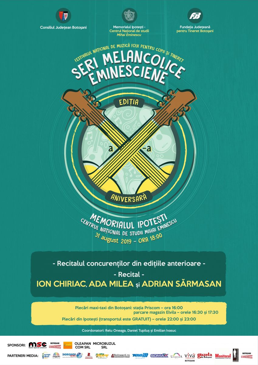 Memorialul Ipoteşti – Centrul Naţional de Studii ”Mihai Eminescu”, în parteneriat cu Fundația Județeană pentru Tineret Botoşani, organizează Festivalul Naţional de Muzică Folk pentru Copii şi Tineret „Seri melancolice eminesciene”, ediţia a X-a, aniversară.