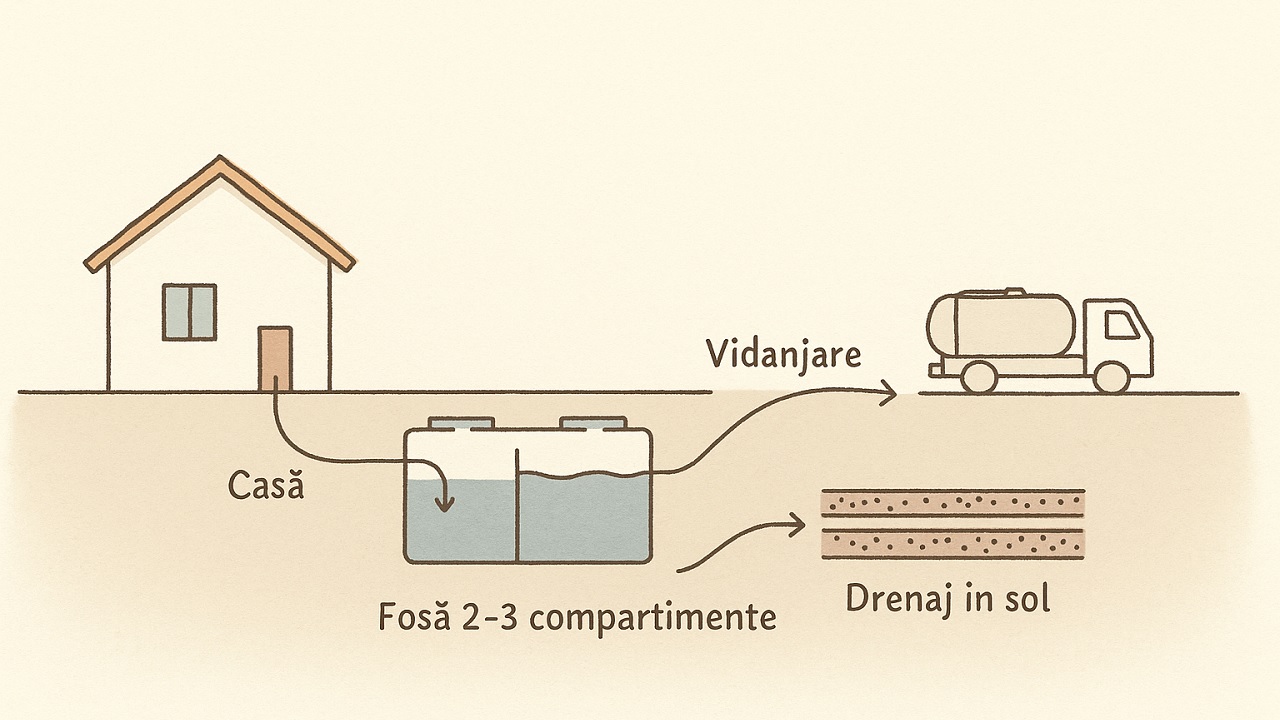Al treilea pas: solul și modul de evacuare. Pe terenuri cu argilă sau cu nivel freatic ridicat, drenajul poate fi dificil; în asemenea situații, e posibil să fie nevoie de soluții alternative (vidanjare mai frecventă sau sisteme suplimentare de tratare). În schimb, pe soluri bine drenante, câmpul de infiltrație dimensionat corect preia efluentul fără să colmateze.