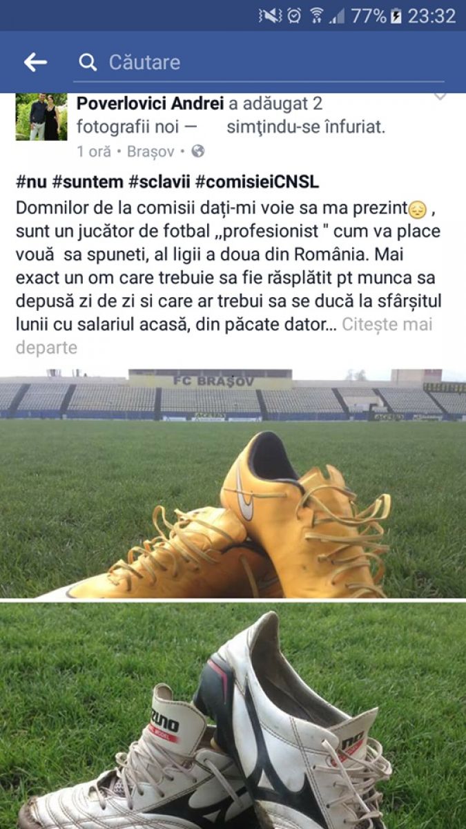 Cum Comisia ezită să dea un verdict definitiv, lupta pentru promovare și implicit existența clubului se clatină serios, motiv pentru care căpitanul Andrei Poverlovici a ales să protesteze într-un mod inedit: și-a postat pe Facebook două imagini cu ghetele sale, cusute pe toate părțile, alături de un mesaj pentru membrii Comisiei.