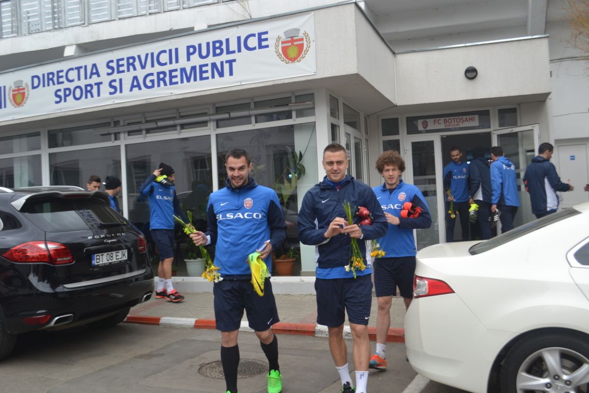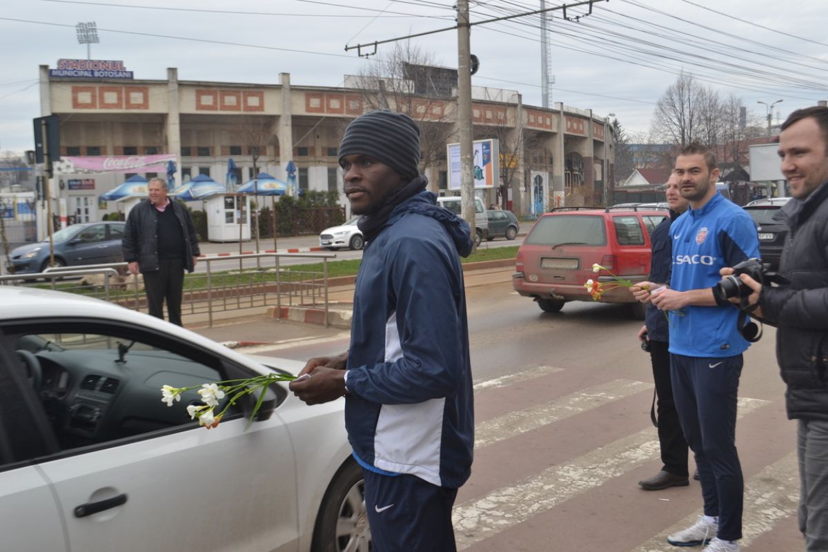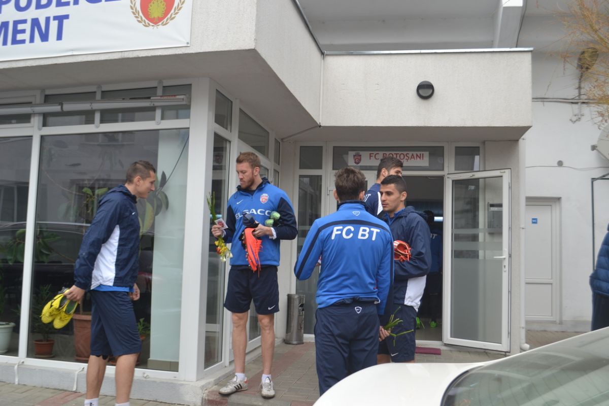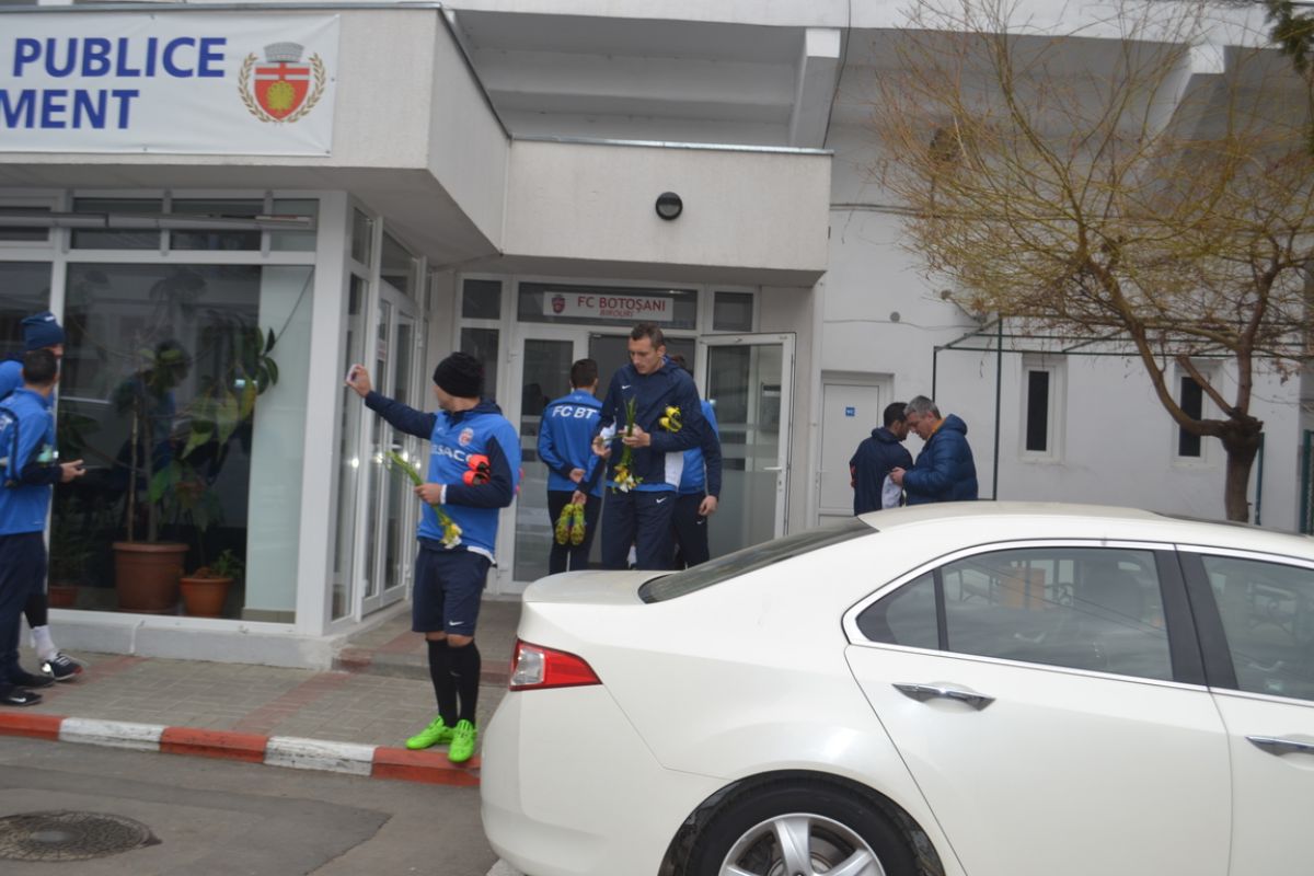 În jurul orei 11:00, mai mulți fotbaliști de la FC Botoșani au ieșit de la club cu o mulțime de flori și de abțibilduri promoționale pentru a le împărți tuturor femeilor din zona stadionului.