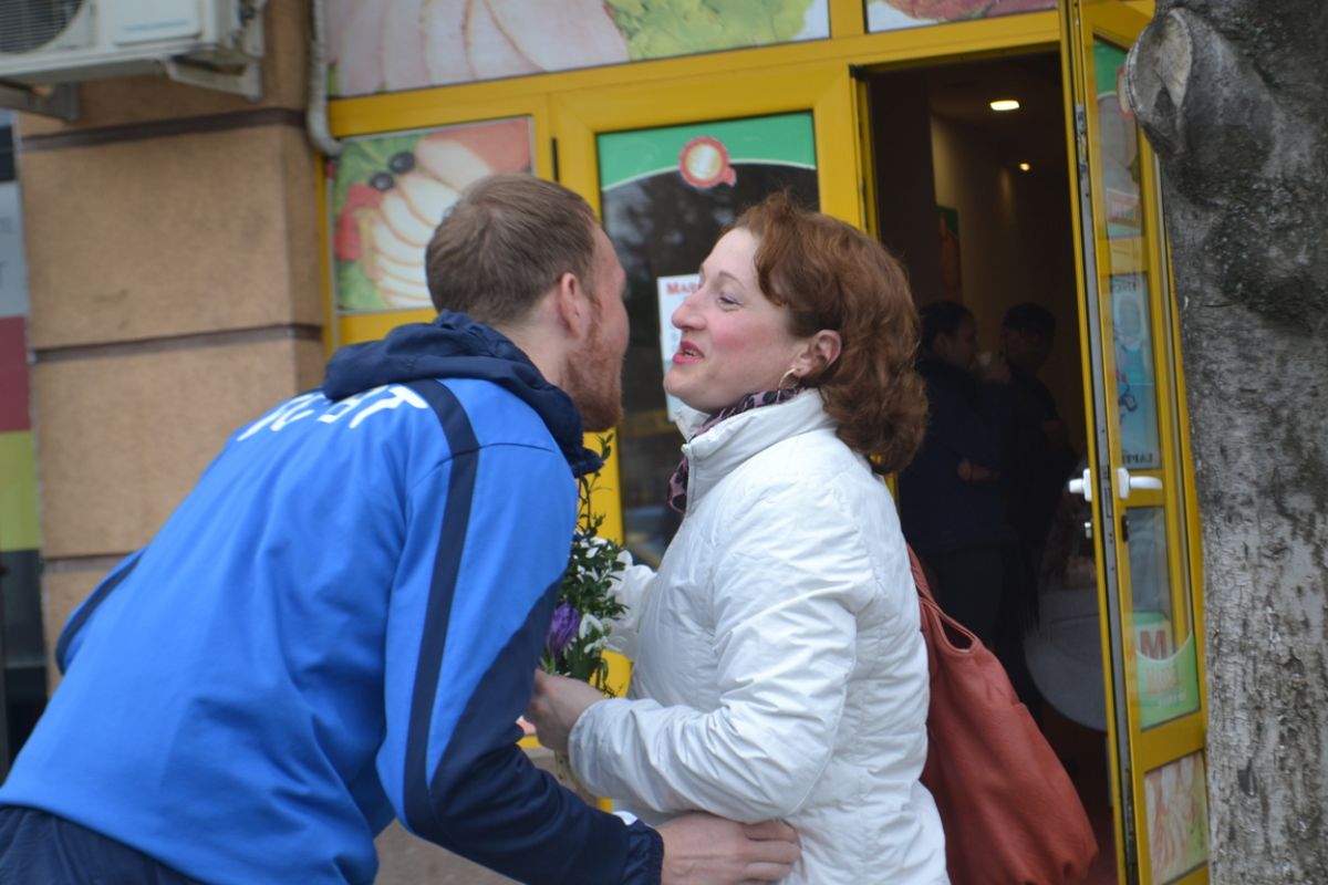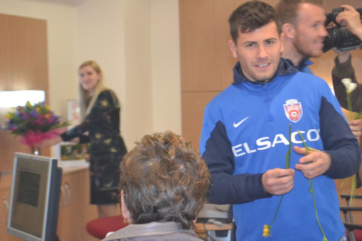 Portarul Răzvan Pleșca a intrat chiar într-un într-un tramvai care pare că oprise special pentru acest lucru și a împărțit flori și materiale promoționale. Alții au intrat în micuțele chioșcuri de lângă stadion și le-au oferit daruri vânzătoarelor.