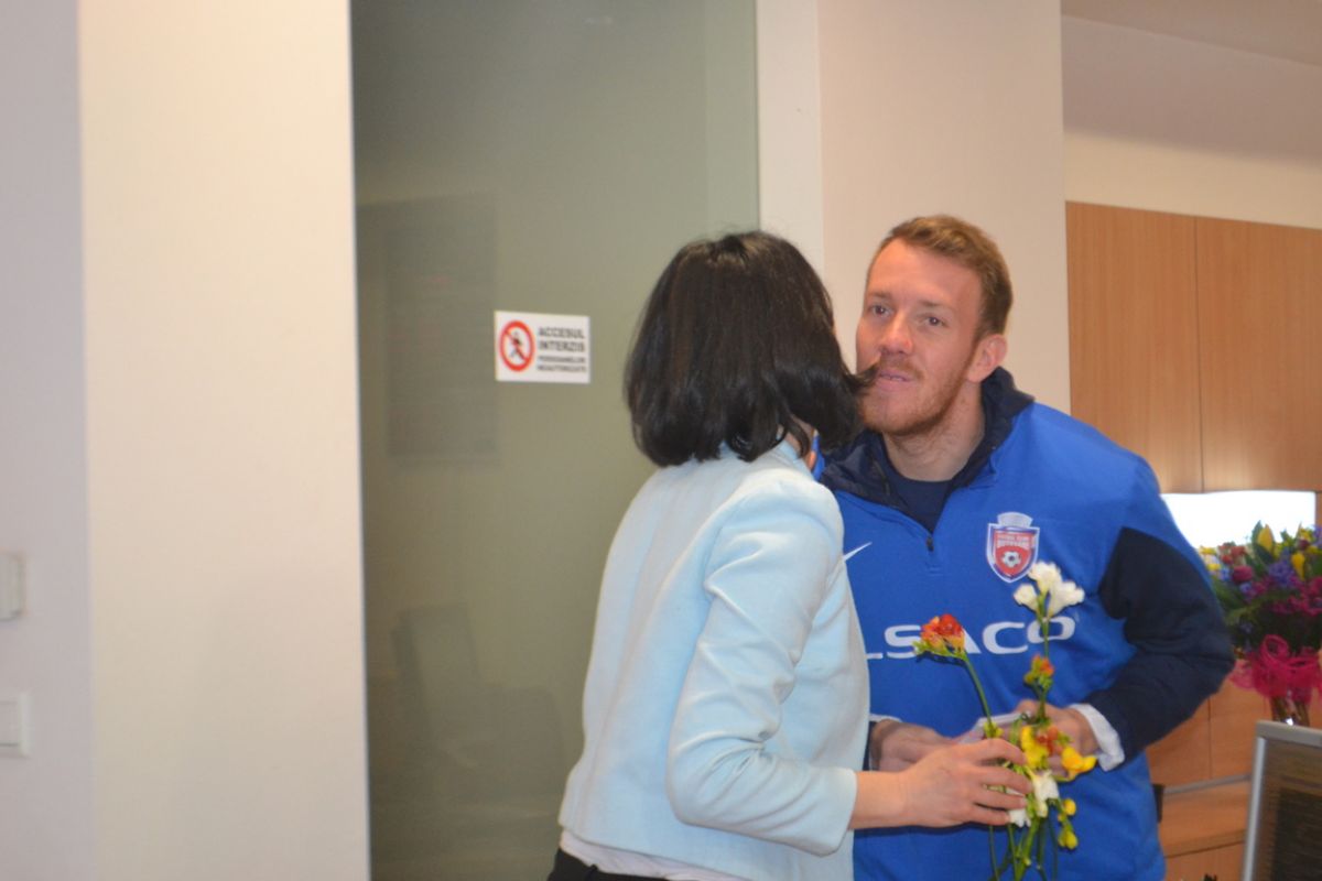 Atacantul Mihai Roman a fost primul care s-a conformat și s-a dus la bătrânele de afară, oferind câte o floare.